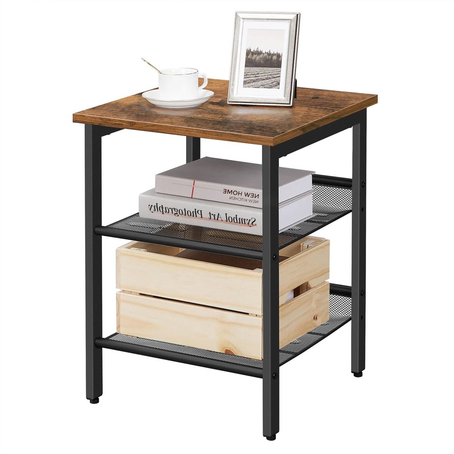 Modern Industrial End Table Nightstand Black Metal Brown Wood Top Side Table
