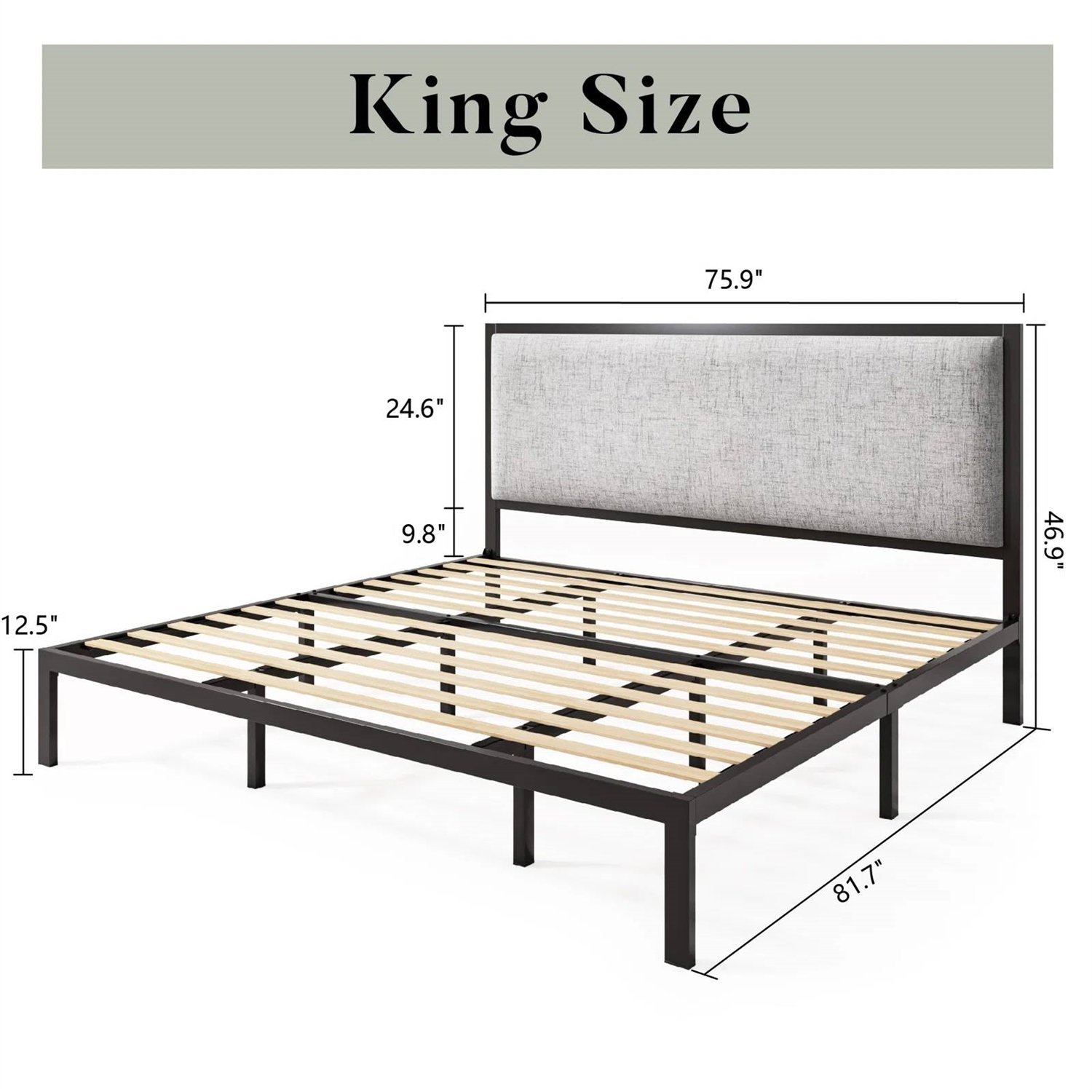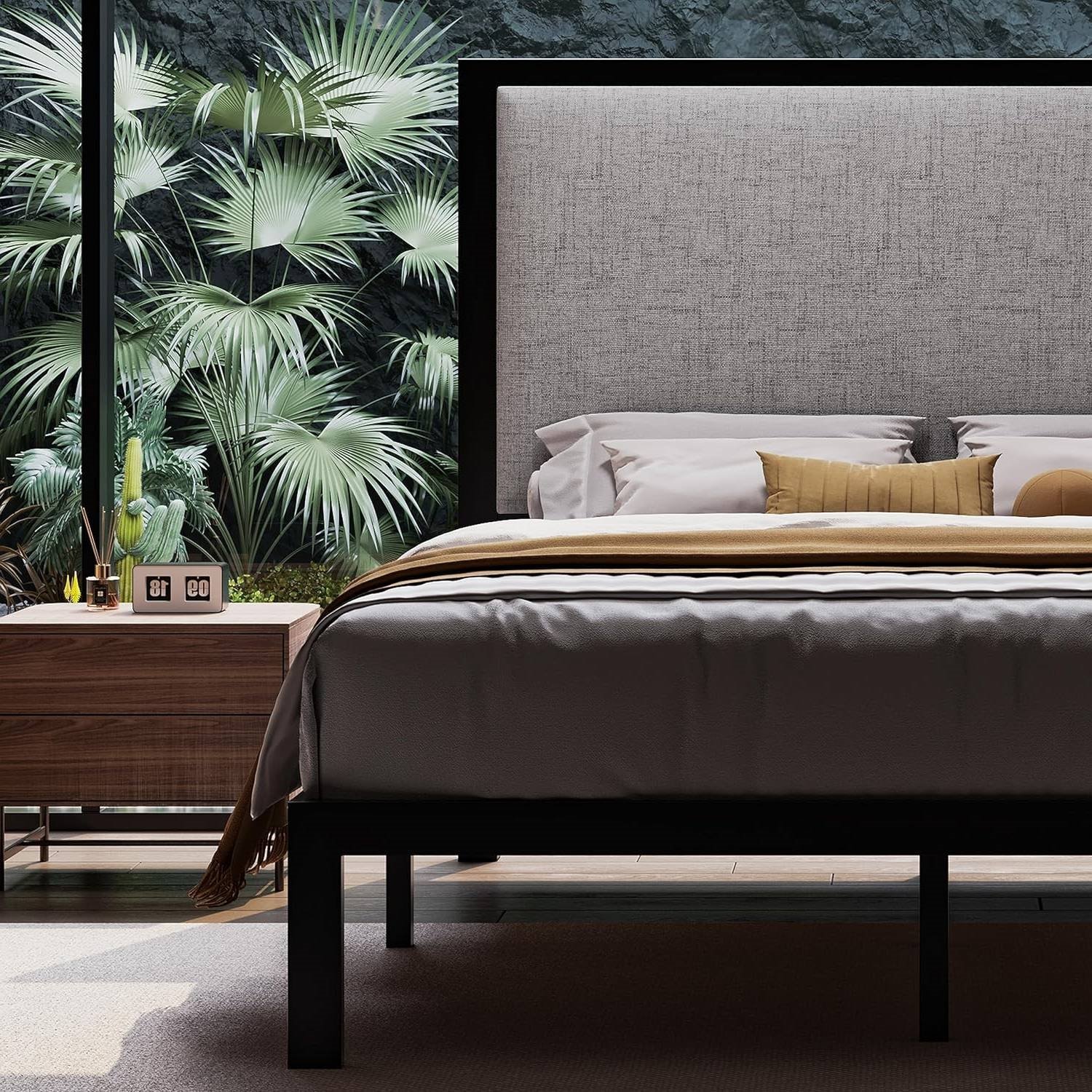 Home > King Black Metal Platform Bed Frame with Tall Grey Linen Upholstered Headboard
