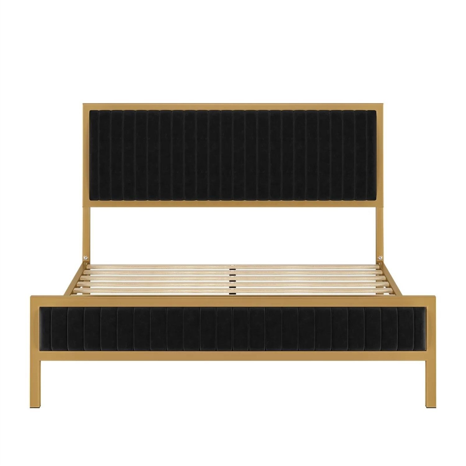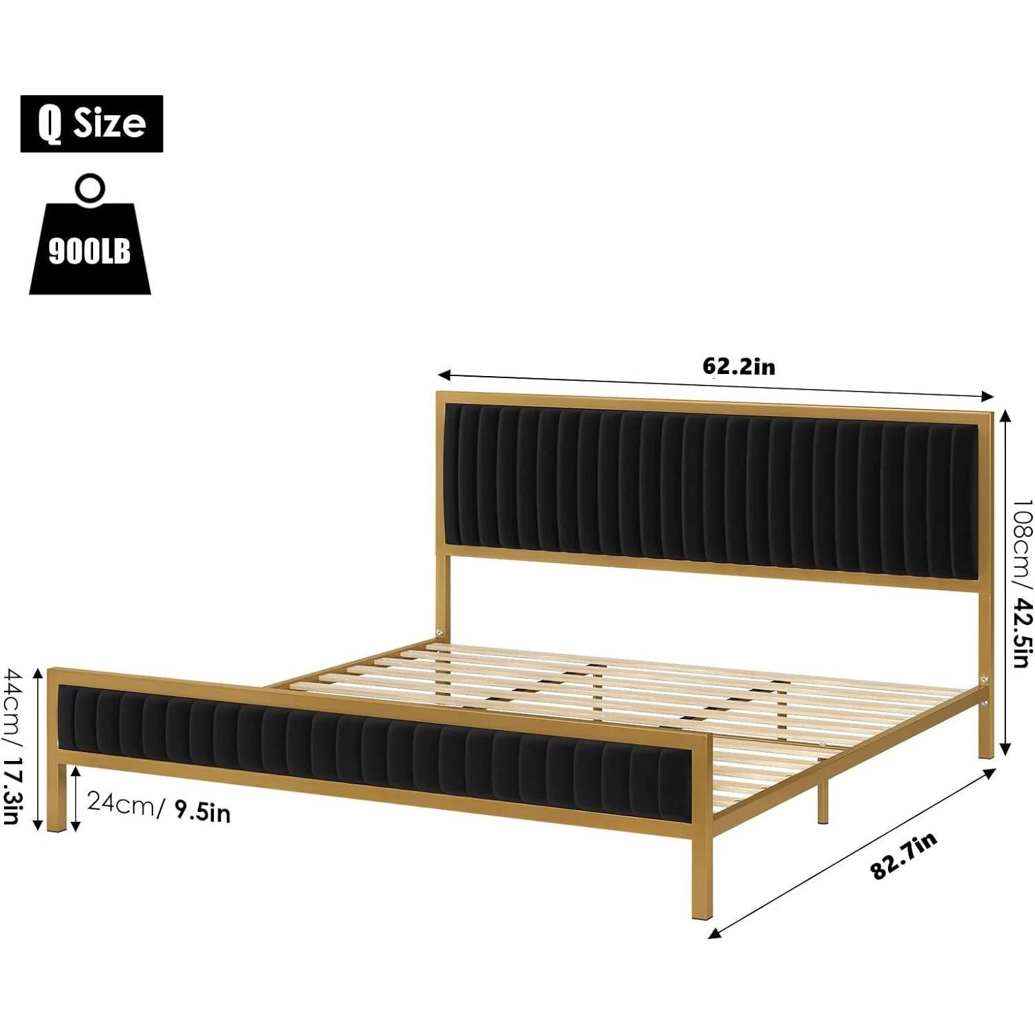 Queen size Gold Metal Platform Bed Frame with Black Velvet Upholstered Headboard