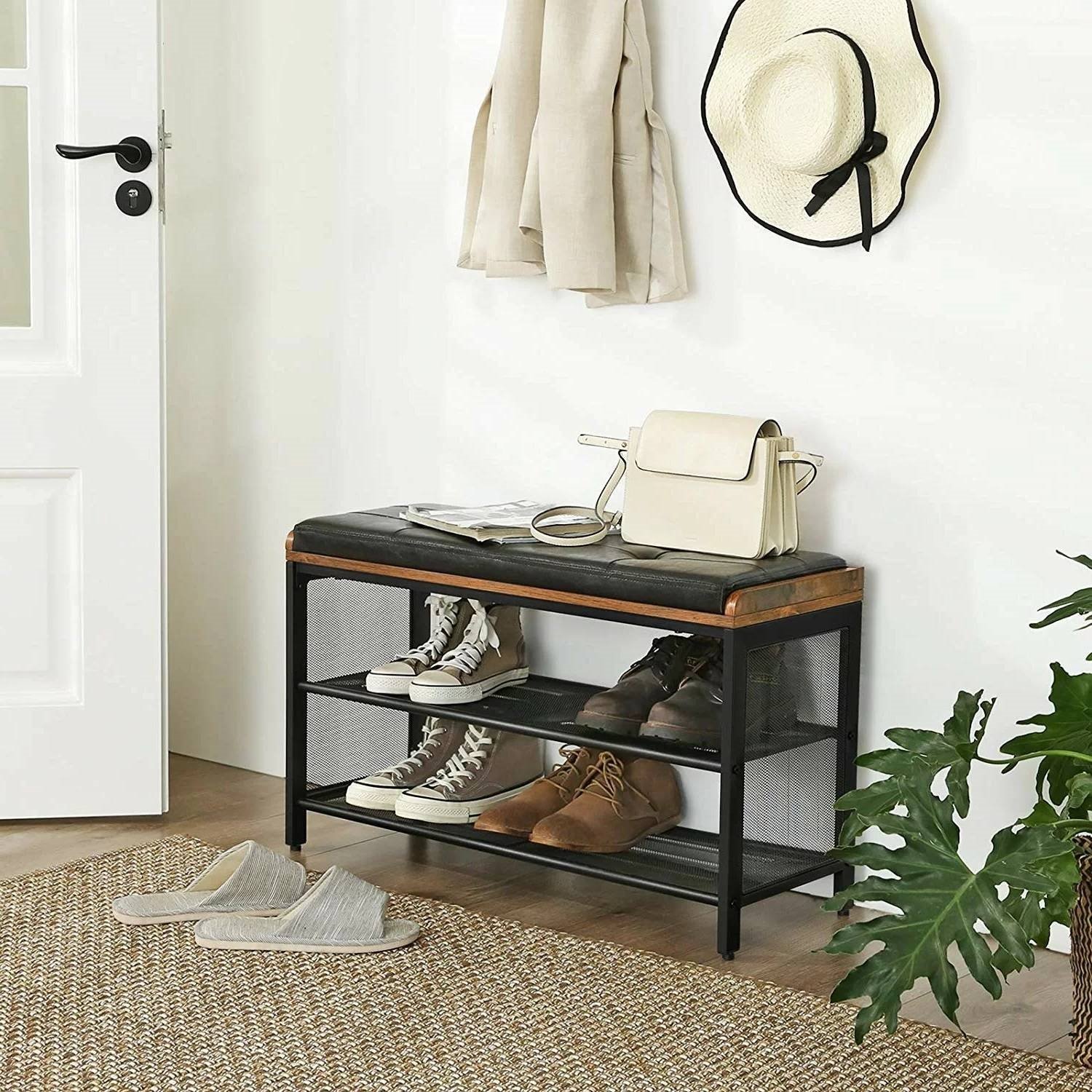 Home > Black Metal Entryway Shoe Rack Storage Bench with Padded Seat Cushion