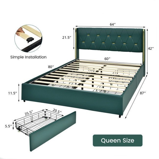 Queen Size Green/Gold Linen Headboard 4 Drawer Storage Platform Bed