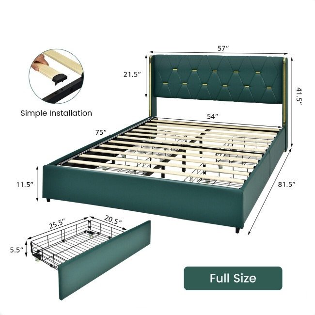 Full Size Green/Gold Linen Headboard 4 Drawer Storage Platform Bed
