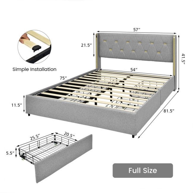 Full Size Grey/Gold Linen Headboard 4 Drawer Storage Platform Bed