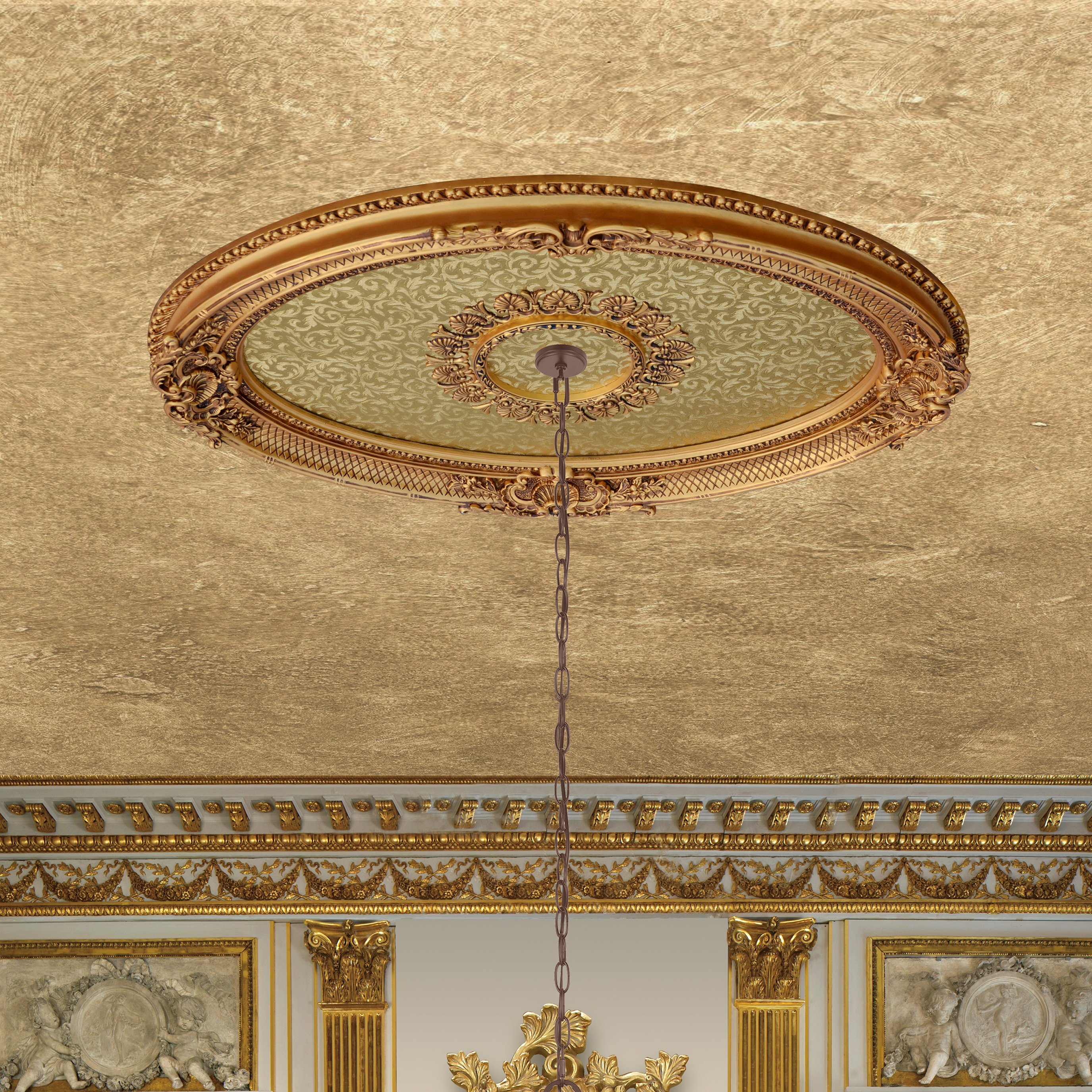 The 43 inchx31.5 inch Golden Oval Ceiling Medallion is a grand lighting application for fine homes. This ceiling lighting accessory comes prefinished in beautiful two tone gold accented with a slightly raised floral pattern center panel. A 1.5 inch center hole is provided for easy installation of the ceiling molding with chandeliers and fans. Enhance the architecture of your home with this decorative ceiling medallions unique finish and details transforming otherwise vast plain ceiling spaces.Light weight, this decorative ceiling medallion is precision cast using durable polymers that are No shrinking and 100 percent waterproof. Installation can easily be done with architectural adhesive and finishing nails. Instantly provide your ceiling space or walls with rich architectural details that are long lasting, maintenance free, and add value to your home giving you the look of expensive custom crown molding trim work at an affordable price.