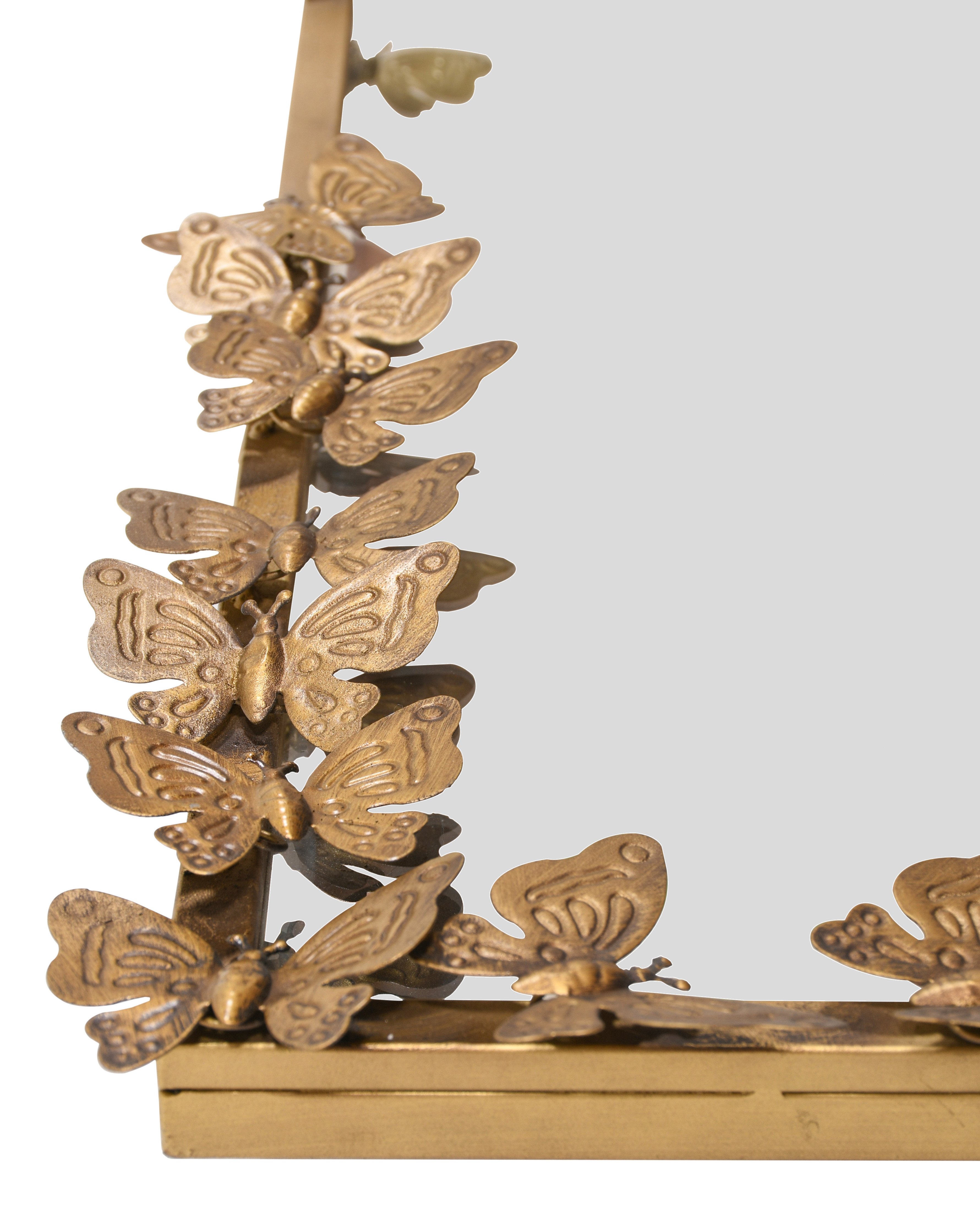 The charming Butterfly Accent Mirror—an enchanting addition to elevate your decor. This 21 x 30-inch mirror is framed with intricately crafted iron butterflies, creating a delightful three-dimensional effect that adds depth and whimsy to any space. The butterflies, finished in a brushed gold hue, lend a touch of elegance and charm to this accent mirror. The golden finish not only enhances the mirror's visual appeal but also complements a variety of interior styles, making it a versatile and stylish choice for your home. Whether hung in a bedroom, hallway, or living room, this Butterfly Accent Mirror is more than just a reflective surface; it's a captivating piece of art that brings a sense of nature-inspired beauty indoors.
