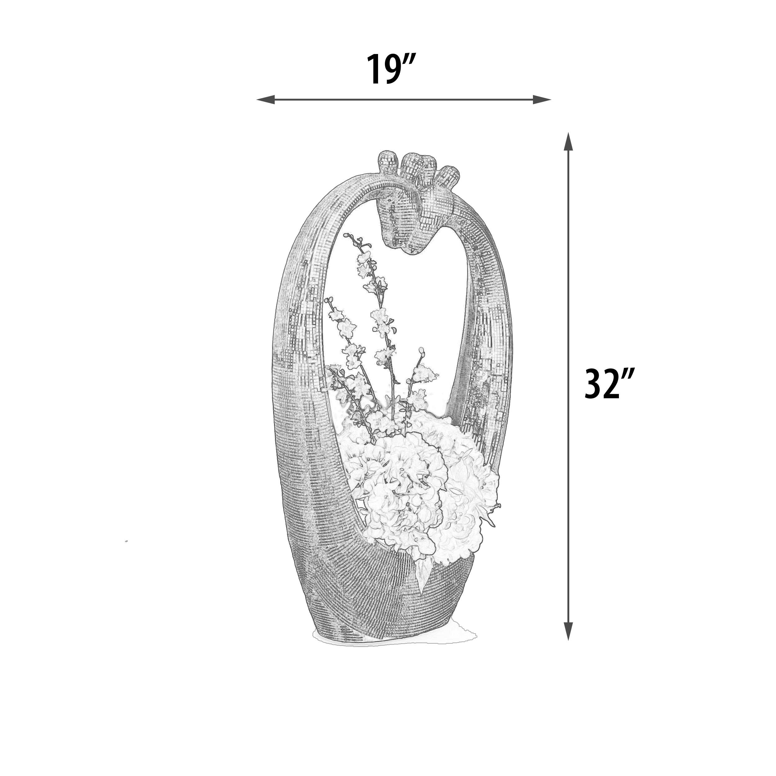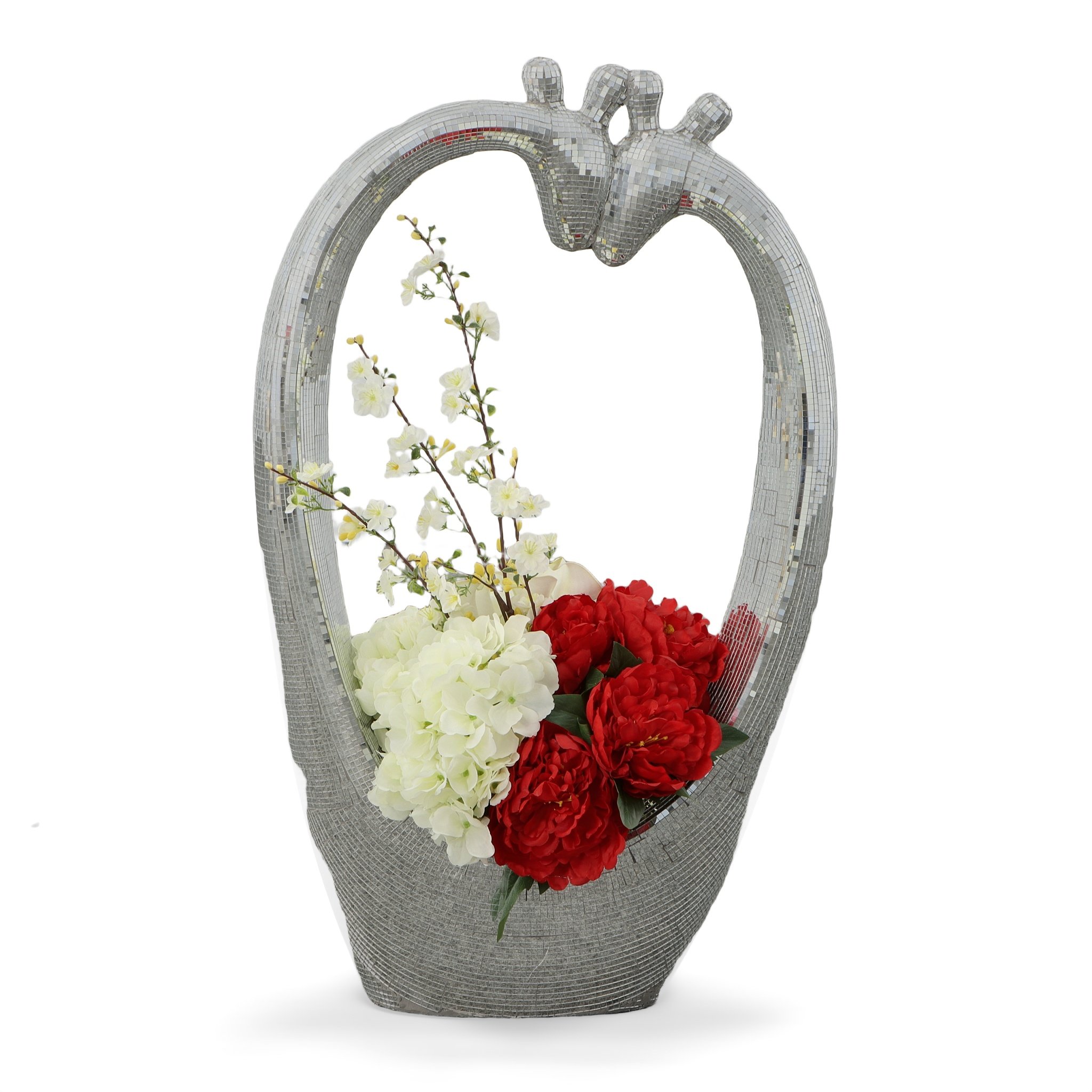 Elegant and modern mosaic mirror vase with a sweet design of giraffes feeling in love, with a beautiful display of red and white flowers for that romantic air