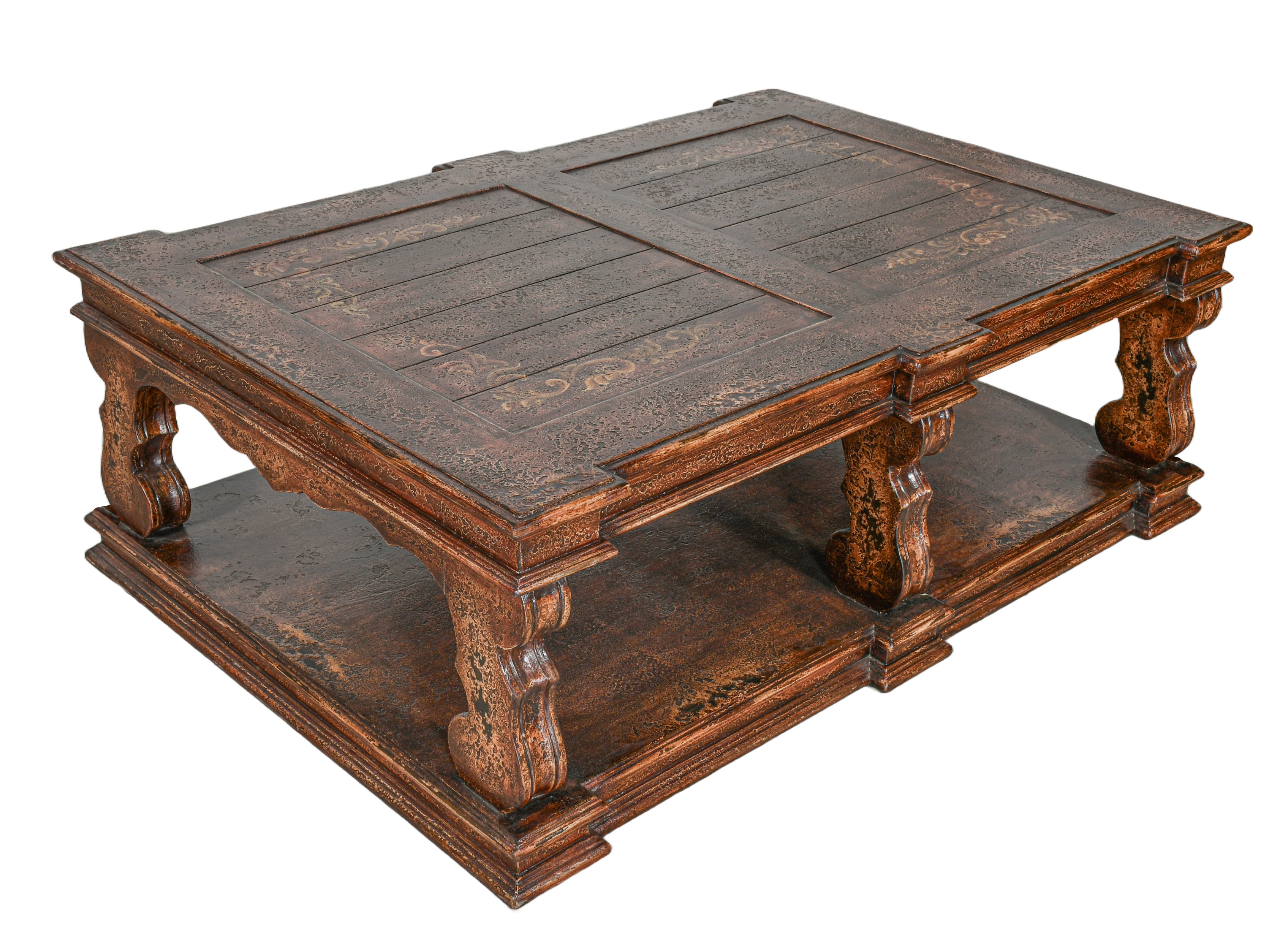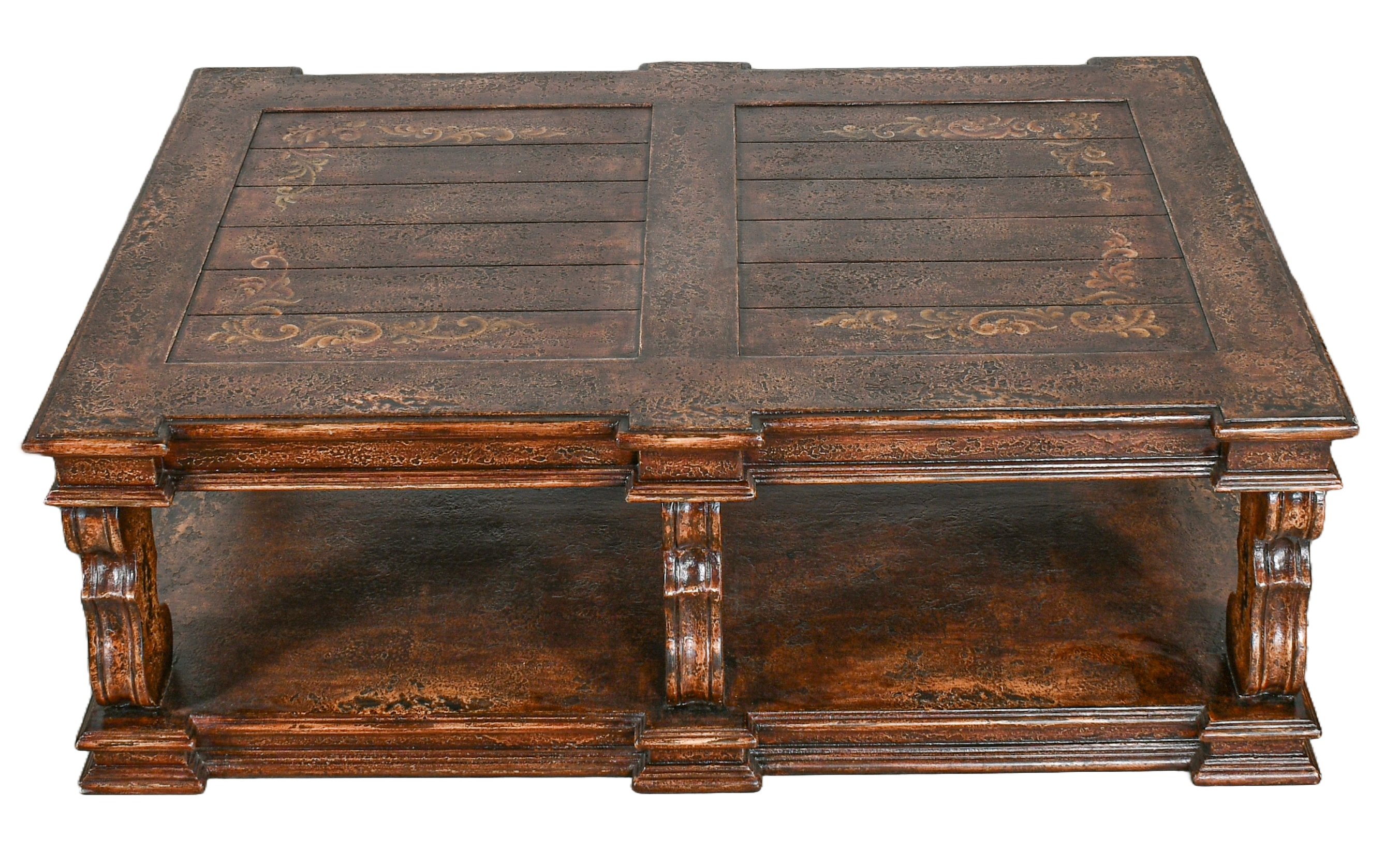 The Inca Grand Coffee Table is a large cocktail table from our Inca Series at 62" wide and offers depth of 42". This series boasts a Spanish influence with large scaled details and its multi layered finish of light and dark sienna and brown tones with subtle natural contrasts resulting from hand rubbing and exposing the rich wood undertones then delicately detailed with hand painted soft scrolls. Consider pairing this table with the matching Inca side tables or console also offered in our Inca series. These tables offered are from our Santa Lucia Collection which consists of handmade, hand painted, and distressed solid wood furniture making each piece a timeless investment. Hand crafted treasures made one piece at a time, under one roof, by our exclusive family owned manufacturer from Lima, Peru. Their master artisans are skilled in furniture making techniques influenced by the Spanish during the colonization of Peru. Many items in the diverse collection feature specialty hand painted finishes that have also been passed on and perfected from generation to generation. The family strives to be environmentally friendly by using woods re-purposed from haciendas and old colonial homes as well as wood indigenous to South American forests, primarily mahogany, cedar, moena and requiem. If you are a lover of beautiful painted furniture, find hill country rustic romantic, or find richness in Mediterranean lore Then you too may fall in furniture love with this fine collection.