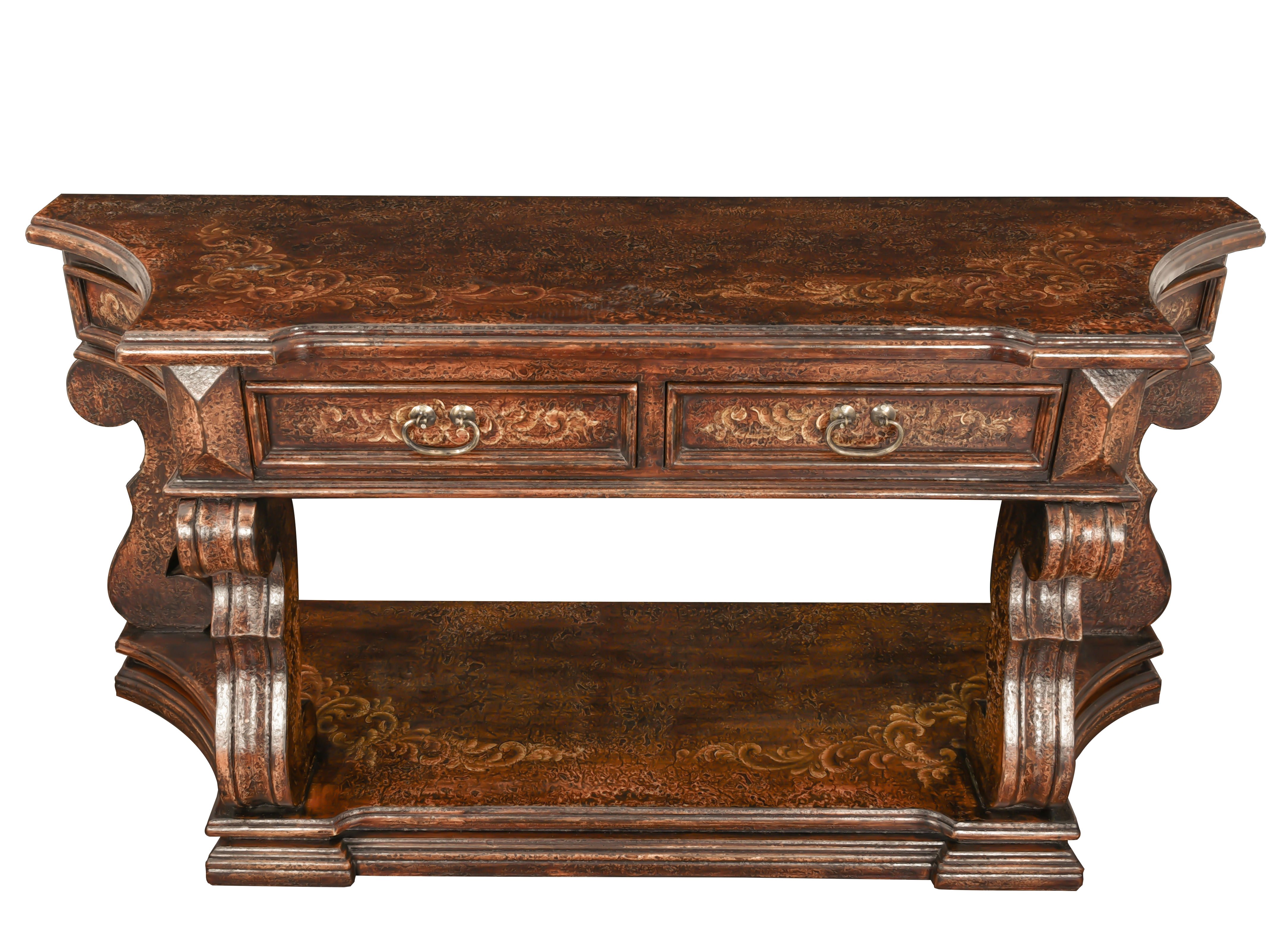 The Inca Grand Console Table is a large console table from our Inca Series at 72" wide and 36" tall. This series boasts a Spanish influence with large scaled details and its multi layered finish of light and dark sienna and brown tones with subtle natural contrasts resulting from hand rubbing and exposing the rich wood undertones then delicately detailed with hand painted soft scrolls. While this a perfect stand alone entry or hall console for a larger pairing consider matching with other items from our Inca series Cocktail/Coffee and/or End tables. The Inca Series is from our Santa Lucia Collection which consists of handmade, hand painted, and distressed solid wood furniture making each piece a timeless investment. Hand crafted treasures made one piece at a time, under one roof, by our exclusive family owned manufacturer from Lima, Peru. Their master artisans are skilled in furniture making techniques influenced by the Spanish during the colonization of Peru. Many items in the diverse collection feature specialty hand painted finishes that have also been passed on and perfected from generation to generation. The family strives to be environmentally friendly by using woods re-purposed from haciendas and old colonial homes as well as wood indigenous to South American forests, primarily mahogany, cedar, moena and requiem. If you are a lover of beautiful painted furniture, find hill country rustic romantic, or find richness in Mediterranean lore Then you too may fall in furniture love with this fine collection.