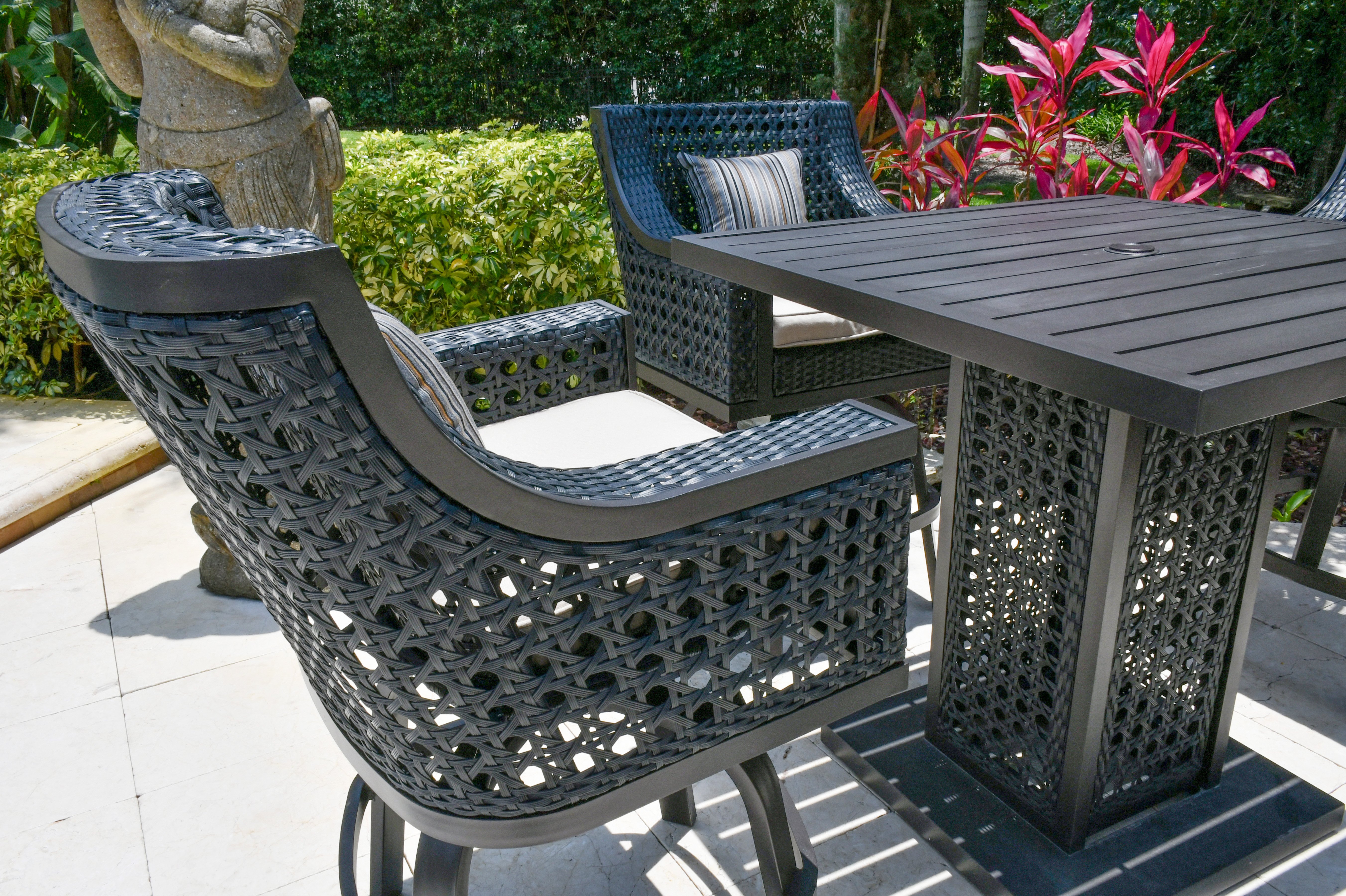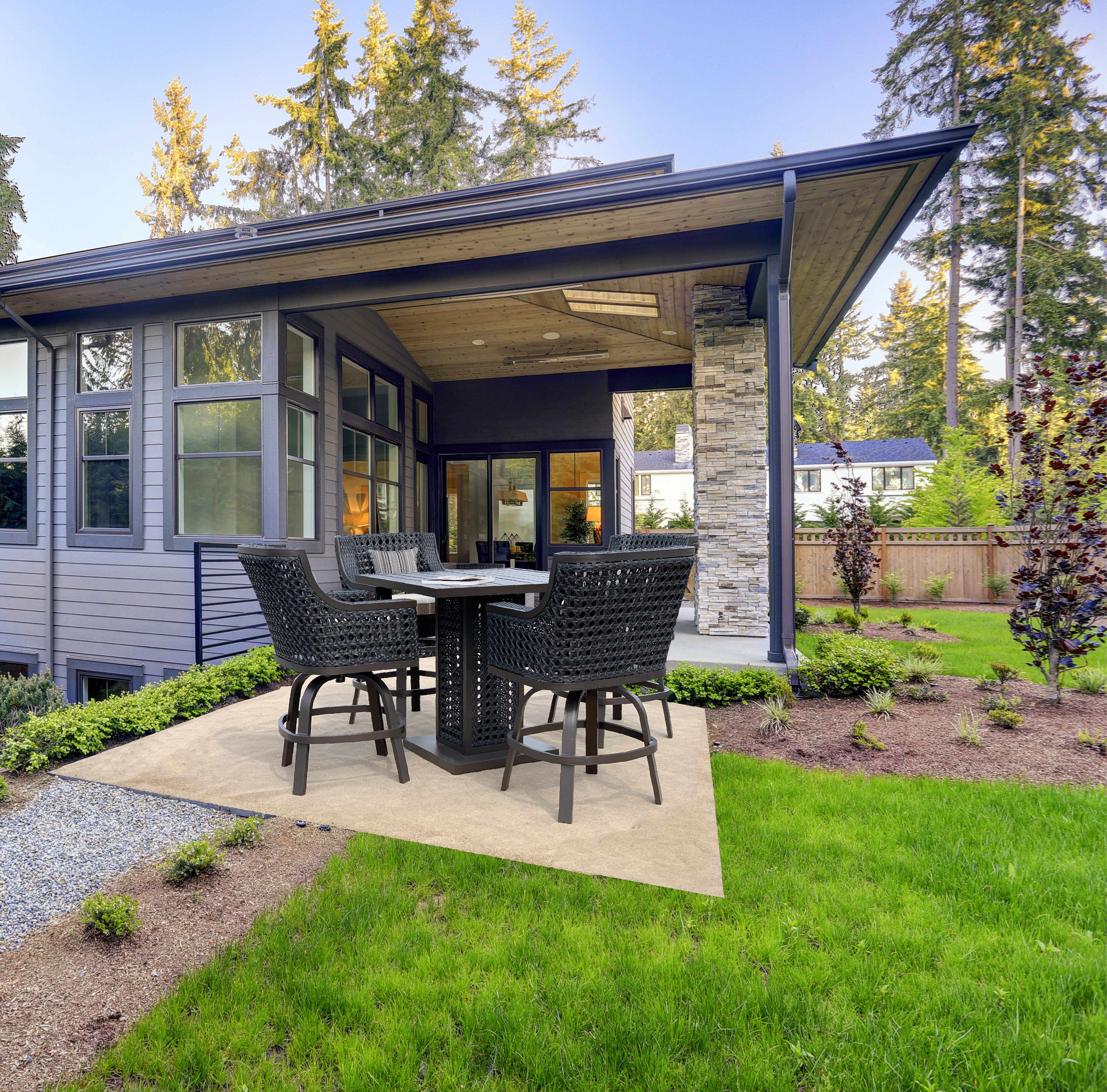 The complete Monterey 5pc Outdoor Pub Table Set from Bridgeton Moore is reminiscent of modern luxury resort furniture. The design seamlessly merges the beauty and style of interior furniture with the functionality and construction of premium outdoor patio furniture. In today's design ethos, homeowners view the exterior of their homes as an extension of their interior design, and this collection embodies that philosophy. From Bridgeton Moore Outdoor Furnishings the Monterey complete pub set is made in aluminum and accented with UV split and crack resistant poly weave on the chairs. The poly weave construction accommodates expansion and contraction in various climates, preventing cracking and splitting. The cushions feature special quick-drying cores and upholstered in Sunbrella Brand fabric, renowned for its longevity and resilience in outdoor settings. Sunbrella fabrics are colorfast and UV resistant, ensuring lasting beauty without fading. Even bleach won't harm the cushion covers, which can be easily removed and washed. The Monterey Collection offers a variety of patio furniture to complete any outdoor project, from dining to seating arrangements. Backed by Bridgeton Moore's commitment to quality, the Monterey Pub Set comes with an industry-leading warranty of 3 years on all frames and finishes under normal conditions. For year-round outdoor exposure, we recommend using covers and regularly cleaning the furniture surface to protect the finish. Experience the perfect blend of functionality, elegance, and comfort, creating unforgettable moments with family and friends in your outdoor oasis.
