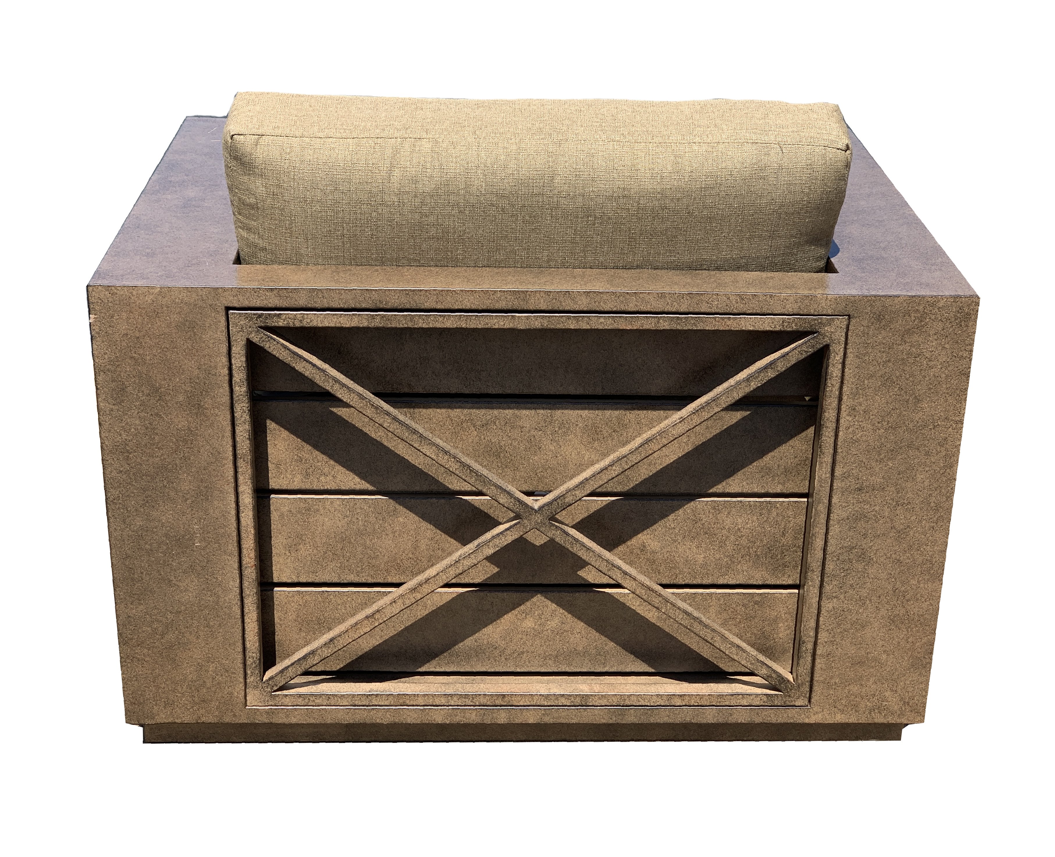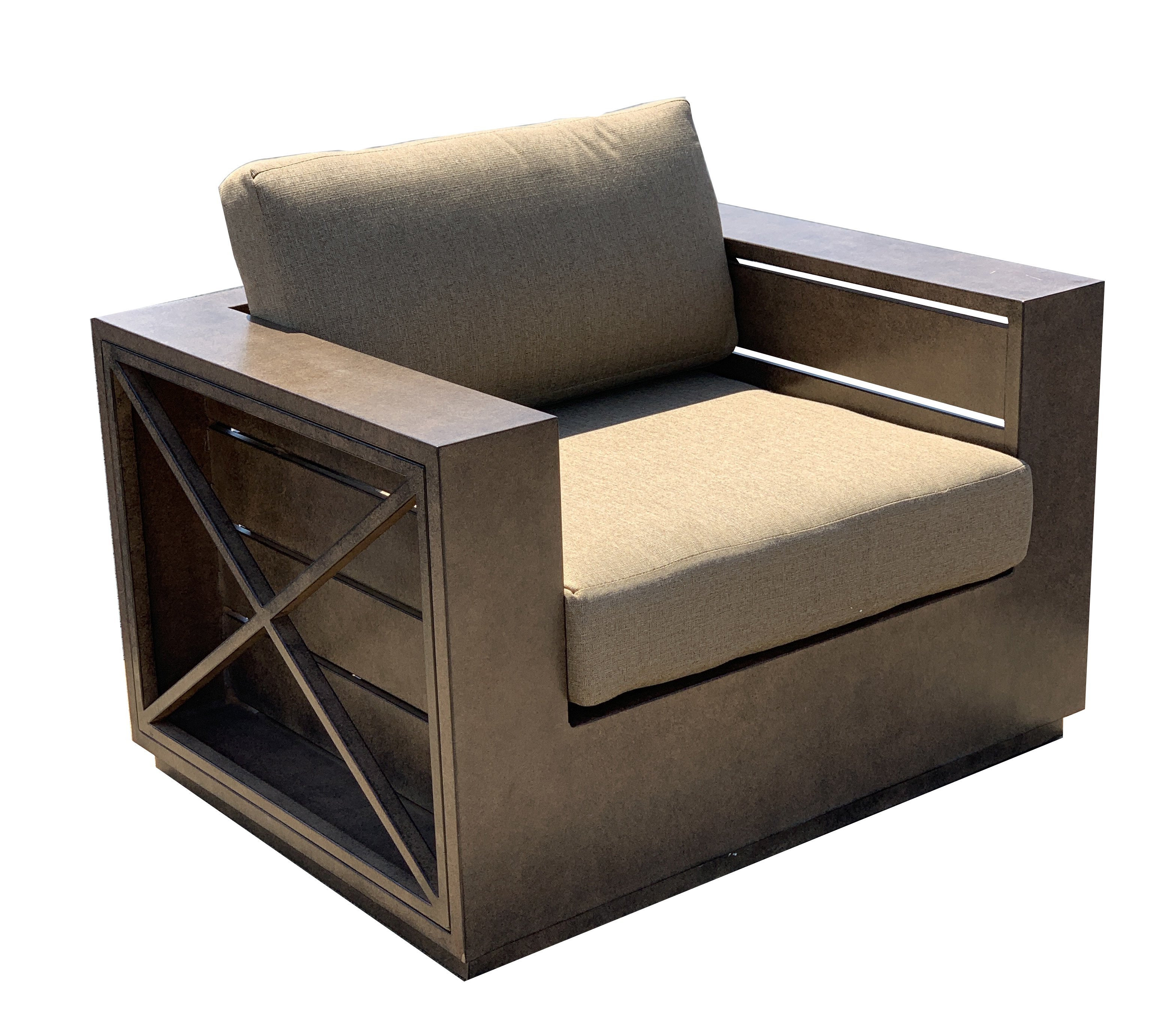 The Mountain Studio Outdoor Club Chair is wonderful outdoor chair. It is pure design removed of unnecessary elements and beautifully executed. A style that elegantly blends into Nature. Not overpowering it. You will also love the quality of this Bridgeton Moore's Mountain Studio's Exclusive Collection. It is Hand crafted and Cast in 100 % Aluminum, that will never rust. Hand Finished 1 item at a time combining soft hand dry brushing and all weather powder coat finishing in a light brown Cappuccino tone. The seating is thicker and plush with seat backs and cushions covered in a neutral Linen all weather Sumbrella Fabrics. An example of bringing the beauty and designs of interior furniture and combining it with the functionality and construction of quality outdoor patio furniture. Today's designers and homeowners consider the exterior of your home an extension of the interior design of your home. Mountain Studio Outdoor Club Chair with its clean lines offers a minimalist contemporary design that makes a quality statement in any outdoor setting. Whether relaxing with family or entertaining guests at a party this set will hold up to even the most active of lifestyles. Consider combining it with other Offering from the Mountain Studio Outdoor Collection manufactured by Bridgeton Moore. Bridgeton Moore has established high brand quality standards and offers one of the best warranties in the Industry, 3 years on all frames and finish under normal conditions, fabrics are all Sumbrella grade and come with a manufacturers supplied two years against any manufacturing defects and or fading from date of purchase. Note * All products used outdoors require reasonable care and that level of care depends on varying external conditions. Covers are recommended for year round outdoor exposure and especially for all coastal applications. Extended exposure in coastal areas can cause corrosion and while this product is used in many coastal applications, they are voided from warranty. Simple hosing down or rinsing off salt exposure if/any will protect and extend the beautiful finish. The fabrics can be easily cleaned in a variety of ways and Sumbrella fabrics are so colorfast they can withstand even the use of bleach. No Assembly Required.
