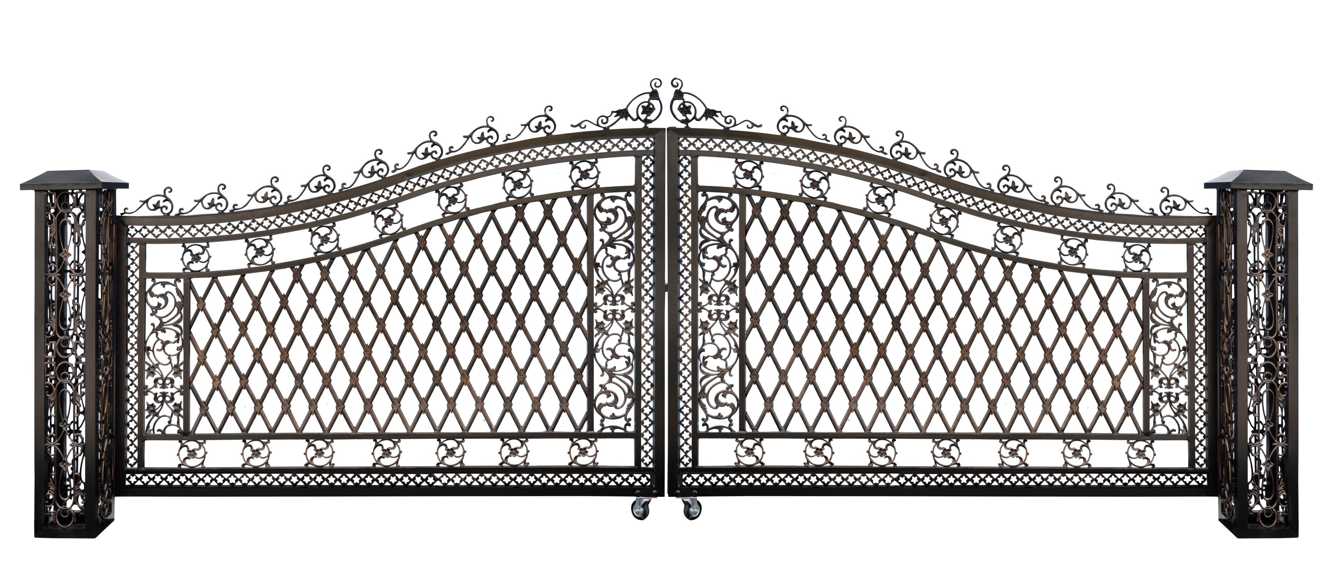 The Bridgeton Moore Aluminum Estate Entry Gate and Fencing Collection offers an Elegant Design. It is an investment in a quality that adds value to your property and makes your home more beautiful and secure. It is also, the only complete estate system of its kind, cast in Aluminum, a system that will never rust. This particular item is the Bridgeton Moore Complete Wide Driveway Entry Gate System 242 Inches Wide, dimensions from outer edge of post to post are 242" wide 16 “ deep X 85" tall providing a 220 “ ( 18’) wide opening. Designed and cast in 100% aluminum that will never rust requiring little to no assembly. The finish is a rich brown bronzed tone with hand brushed highlights that accent the details and then a long lasting double powder coat finish is applied, making this the longest lasting, lowest maintenance, easiest to install, turn-key system in the market for any price. Comprised of a left and a right gate which comes pre-mounted to their respective posts each with a pre-mounted welded wheel for smooth operation and the posts where designed to mount easily to the provided mounting spike. Owners, installers and especially do it yourselfers will love the ease of installation that the systems design and provided mounting spike offers making the installation of such a beautiful gate system as easy as banging the spikes into the ground and then just bolting the post to it, the bottom of post and the top of the mounting spike have pre-drilled holes that will align with each other for bolting down. Note * If the location of installation does not offer a solid soil or for those simply wishing a more permanent installation floating and leveling the mounting spike first into a 16” square or round x 30 “ deep concrete form is advised once hardened you can then bolt the post to the spike ( when leveling your mounting spike leave enough room above the concrete for connecting your bolts, you can fill in this gap with anything appropriate to match the area after connections are made. The decorative scrolls on top of the gates are shipped separately for safety and need to be simply attached. The Bridgeton Moore Estate System is a traditional and exclusive collection of beautiful Driveway and Entry Gates, Fencing, Railings, Posts and Lights cast in 100 % Aluminum. Bridgeton Moore has taken 10 years of developing and evolving this to be the finest most complete system in the market and finally replacing what was only previously available in cast Iron. This intricate level of design and this complete of a collection had never before been available in Aluminum. It required a upfront multi-million dollar investment in giant die cut steel molds to cast the first gate, but now Bridgeton Moore can precision cast each piece efficiently and in their entirety. Aluminum is the best metal for outdoor use 1)….. It doesn’t rust 2) …..The finished product is 1/3 rd lighter in weight then iron, especially important when developing a gate that can be installed easily and operates over long periods of time off hinges and on wheels and 3)……. Will create significant less resistance in the long term use when installing a remote controlled gate opener ( sold separately). For centuries Iron casting was used and while it never could be cast as clean or with the same crispness of details, Iron did provide a customer looking for a beautiful gate the only option. Iron castings are achieved through an inexpensive sand mold process a very efficient process for creating an item which will only be cast in small quantities, Iron costs 28 times less then Aluminum at today’s 4 cents a pound versus aluminum at $1.15. And while the ability to create the beautiful design is comparable that is where the comparison ends. Iron weighs 3 times what aluminum does, making the installation of a large driveway gate like this require installation costs usually double the cost of the gate itself with the Bridgeton Moore Estate System the gate is already pre-hung on the post and you can easily install it yourself 2) Iron rusts and Bridgeton Moore System never rusts 3) Iron requires frequent painting for protection and with the Bridgeton Moore Estate System not for a long time. The decision is easy and with this complete system you can add on and expand now or in the future, Bridgeton Moore offers several sizes of fence options, posts and lanterns. Our customer service associates are knowledgeable and available to help with your ordering. Bridgeton Moore has established high brand quality standards and offers one of the best warranties in the Industry, 3 years on all frames and finish under normal conditions, against any manufacturing defects from date of purchase. Note * All products used outdoors require reasonable care and that level of care depends on varying external conditions. Extended exposure in coastal areas can cause corrosion and while this product is used in many coastal applications, they are voided from warranty. Simple hosing down or rinsing off salt exposure if/any will protect and extend the beautiful finish.