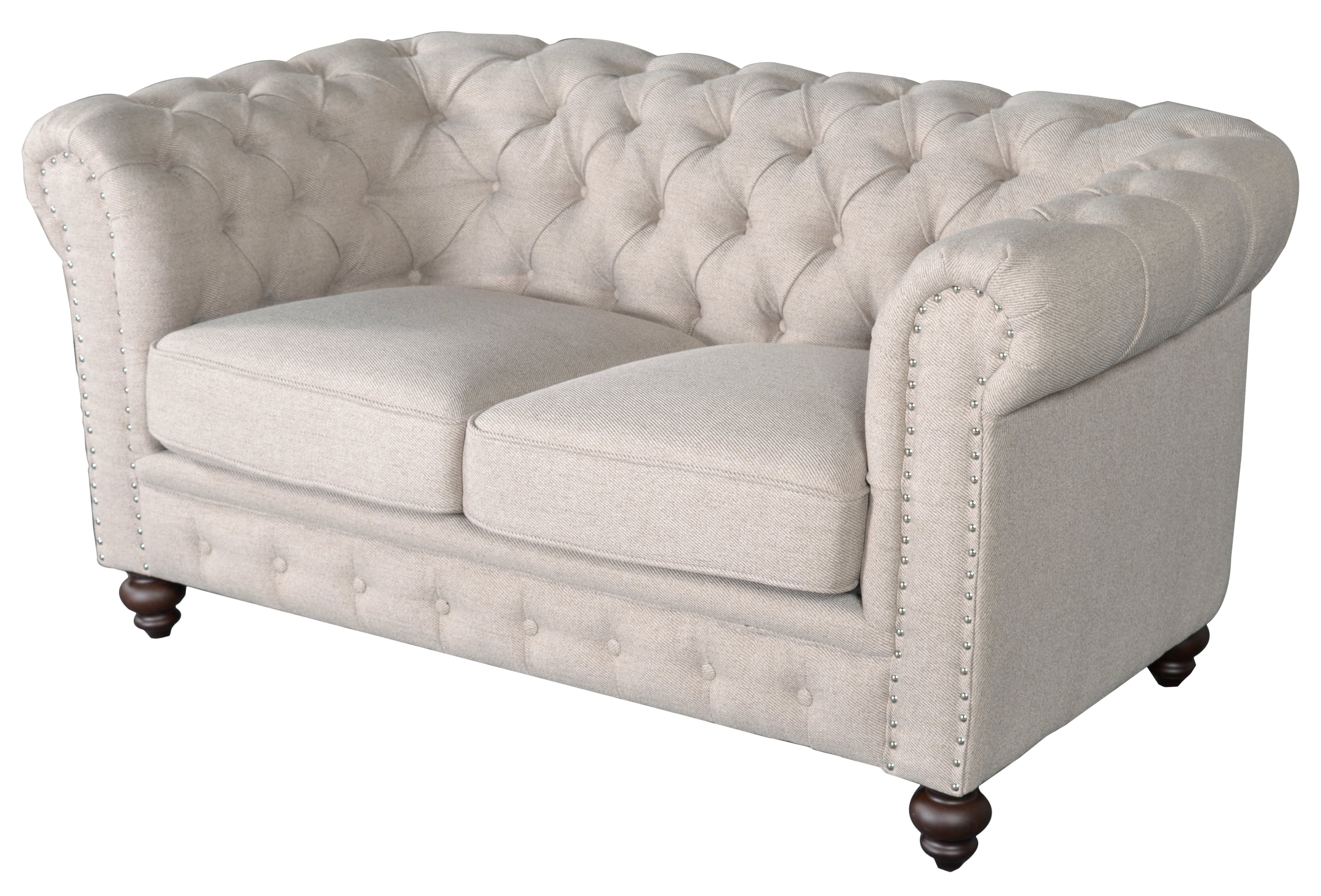 The Classic Chesterfield Loveseat Dark Linen 65 inches Width X 37 inches Deep X 31 inches Tall. In the endless world of sofa style options, the Chesterfield design is Timeless. A style that fits the widest array of interior designs from Semi Modern to Casual Farmhouse, from Urban Transitional to Classic Traditional. The Chesterfield is often a favorite Designer choice. This beautiful offering from the AFD Home Collection is available in various seating configurations from sofa sets to sectionals and is also offered in a variety of popular covers. The frames are constructed in wood and plywood solids. The Cushions are very comfortable with embedded spring coil construction, which also helps keep the seating looking newer longer. The Dark Linen covering shown is a very placeable beige gray color, and the weight of the linen is a notably heavier finer grade. Consider ordering the matching Sofa and Chair to complete the set. Light Assembly of legs required.