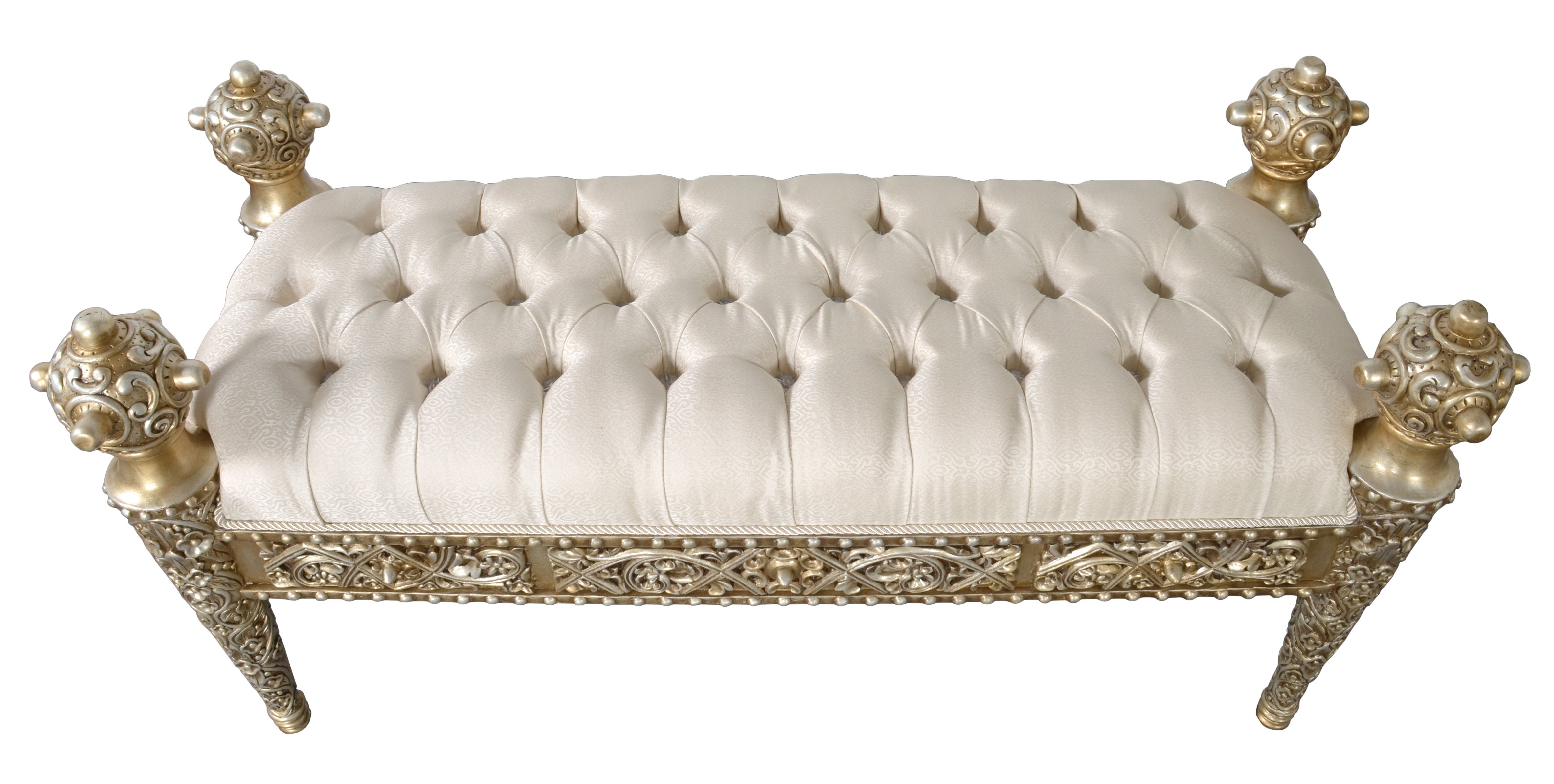 Delve into the refined craftsmanship of the Chapelle 3-Seater Bench from the illustrious Platine Collection by Heritage Furniture. Celebrated for its exquisite design, this bench is more than just a place to sit—it's a showcase of meticulous artistry, hand-carved from mahogany, a wood renowned for its durability and aesthetic appeal. The bench benefits from a comprehensive kiln-drying process, essential for ensuring the mahogany's longevity and resilience, particularly in varying climatic conditions. It undergoes stringent stress and pressure tests, guaranteeing that it not only meets but exceeds expectations of quality and endurance. Adorned with the Platine Collection's trademark finish, a radiant blend of Champagne and Golden Silver, the bench also offers versatility through customizable options. Acknowledging diverse tastes and decor schemes, you have the freedom to select either the luxurious gold finish or any other finish available within the Heritage Collection, tailoring the bench to your personal style and interior design needs. The opportunity to personalize extends further with the option to specify the bench's length or choose your own fabric for the upholstery, ensuring that your Chapelle bench is a perfect match for your space and aesthetic preferences. Whether standing alone as an elegant accent piece or coordinated with other items from the Platine Collection, the Chapelle 3-Seater Bench promises to infuse your home with a touch of sophistication and timeless beauty, complemented by the assurance of handcrafted excellence and lasting quality.