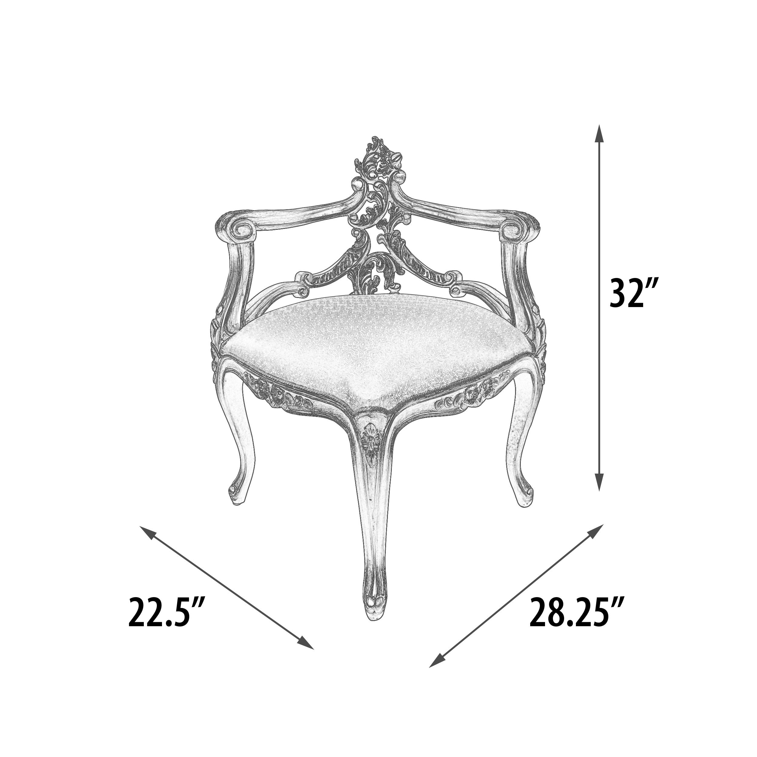 The Platine Venetian Corner Chair is an elegant 28.25 wide x 22.50 deep x 32 inches tall fine hand made mahogany chair. A perfect vanity stool or a corner chair. The smaller scale and corner shape combine with its intricate hand carved details to offer a style befitting the grand dame courts of Venice as well as multiple placements in Todays homes. Hand carved out of solid Mahogany that is then tastefully finished in our Platina finish and upholstered with an imported beautiful Cream Taffeta fabric. Another exclusive design and finish from the Heritage Collection, a division of AFD Home. A collection of fine, hand made furniture in the purest of standards of age old traditional crafting. Each piece is hand carved, one piece at a time, by some of the world's best carvers. The special Mahogany wood comes from replanted forests. The selected wood has been kiln dried. The item in its final form is stress and pressure tested prior to finishing to ensure long lasting stability, in most climates, a Heritage Brand standard. The Platina finish series offers many accompanying items to this settee that can be considered and combined to expand your desired interior. The chair comes fully assembled, a process of finer construction offering a more stable seating. Made by hand and imported from Indonesia.