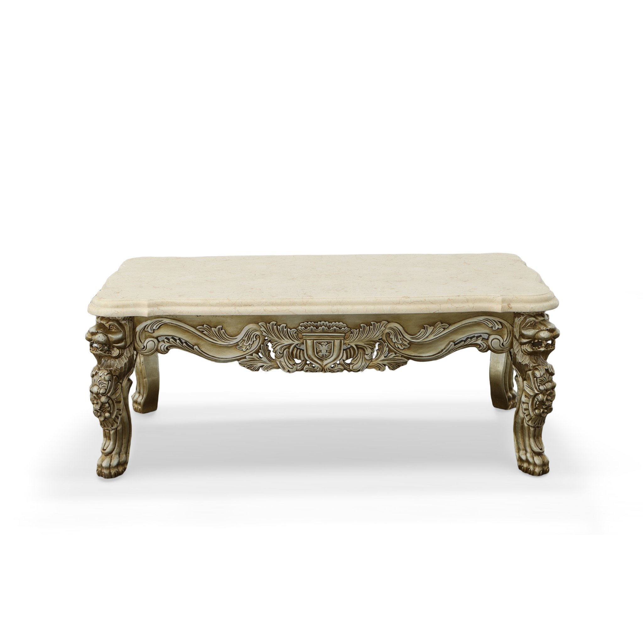 Introducing an exclusive new item, The Platine Lion Coffee Table Hand Carved Mahogany with Cream Marfil Marble Top. Hand Made and Hand Finished by the Master Carvers and Finishers of the Heritage company. A Neo-classical design boasting extensive hand carvings of Lion Masks, Crests, Flowers and scrolls, rare to find in this quality of hand carved workmanship. Dimensions: 51.5 Inches x 28 Inches x 20 Inches Tall. The Platine finish offers hues of Champagne Golden Silver is equally spectacular, a multi step process of actually silver leafing the frames and layering and finishing techniques. The imported scalloped double edge Cream Marfil Marble Top blends tastefully and balances this amazing finishing. While this Cocktail Table is sold separately it pairs beautifully with the matching Platine Lion Side Table Hand Carved Mahogany with Cream Marfil Marble Top for a more complete design. The Platine Collection offers many wonderful options to expand your design, consider any of the Platine matching Upholstery and Occasional pieces from this top Quality Collection. All furniture is hand made and finished 1 piece at a time.