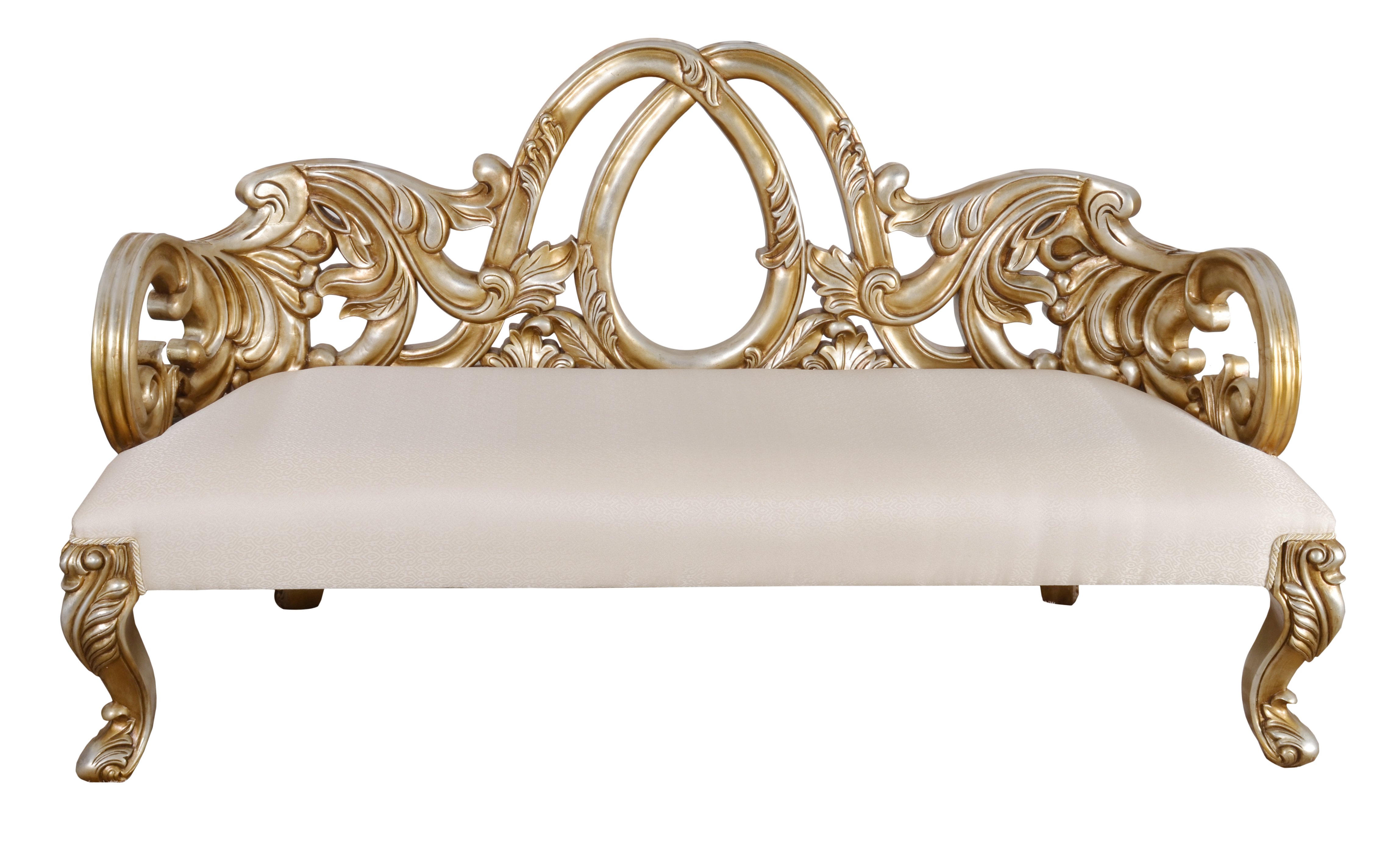 Rich and opulent the Platine bench is handcrafted one piece at a time. Master craftsman select the best pieces of mahogany wood to hand carve the intricate details of the benches frame. Special hand applied multilayer finishing adds tone and depth to the luxurious silver Platine finish. Beautiful ivory upholstered seating perfectly compliments the benches opulence allowing the silver Platine finish to pop off the neutral color. No assembly is required, this heirloom quality furniture ships assembled and ready to use.