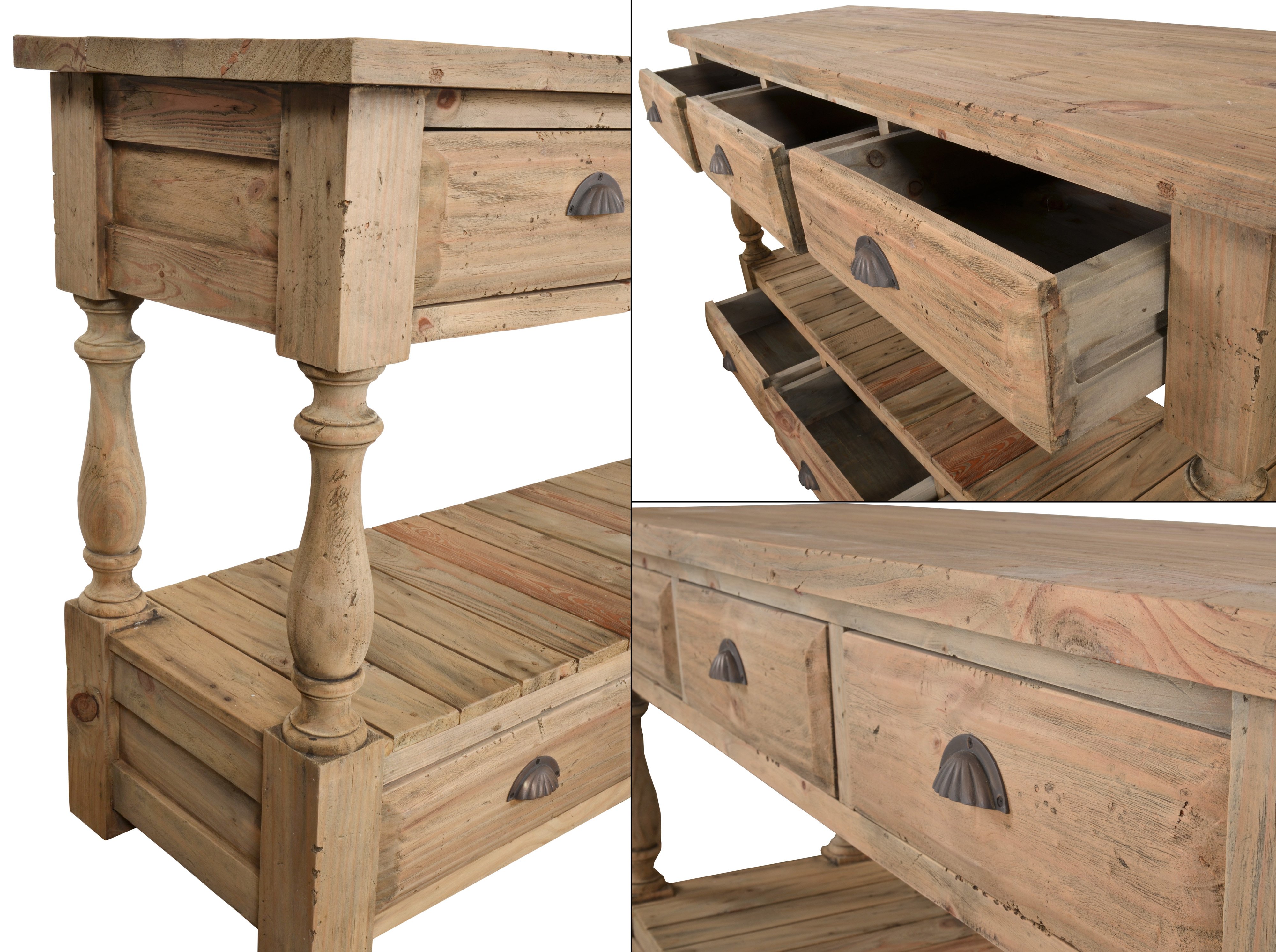 The 63"W Farmhouse Rustic Country Coastal Console Table 6 Drawers at 63" wide x 18" deep x 35.50" tall is a very cool, unique item in the style of an old butcher block counter. It features a thick wood top with 6 drawers, brass towel rail, antiqued hand-hammered hardware. It is a part of a popular new Farmhouse Series from the Heritage Collection. The Farmhouse Series is an expanding series that is affordable yet appropriately fashioned for a more relaxed Farmhouse lifestyle. The style of the collection also can fit with farmhouse interiors as well as southern or new England designed more rustic homes. The items are all hand made using solid bleached pine from Indonesia. The table is sold separately and is a unique stand-alone addition. All of the Farmhouse Series pairs perfectly with each other and can be mixed matched and combined with increasing the desired interior design