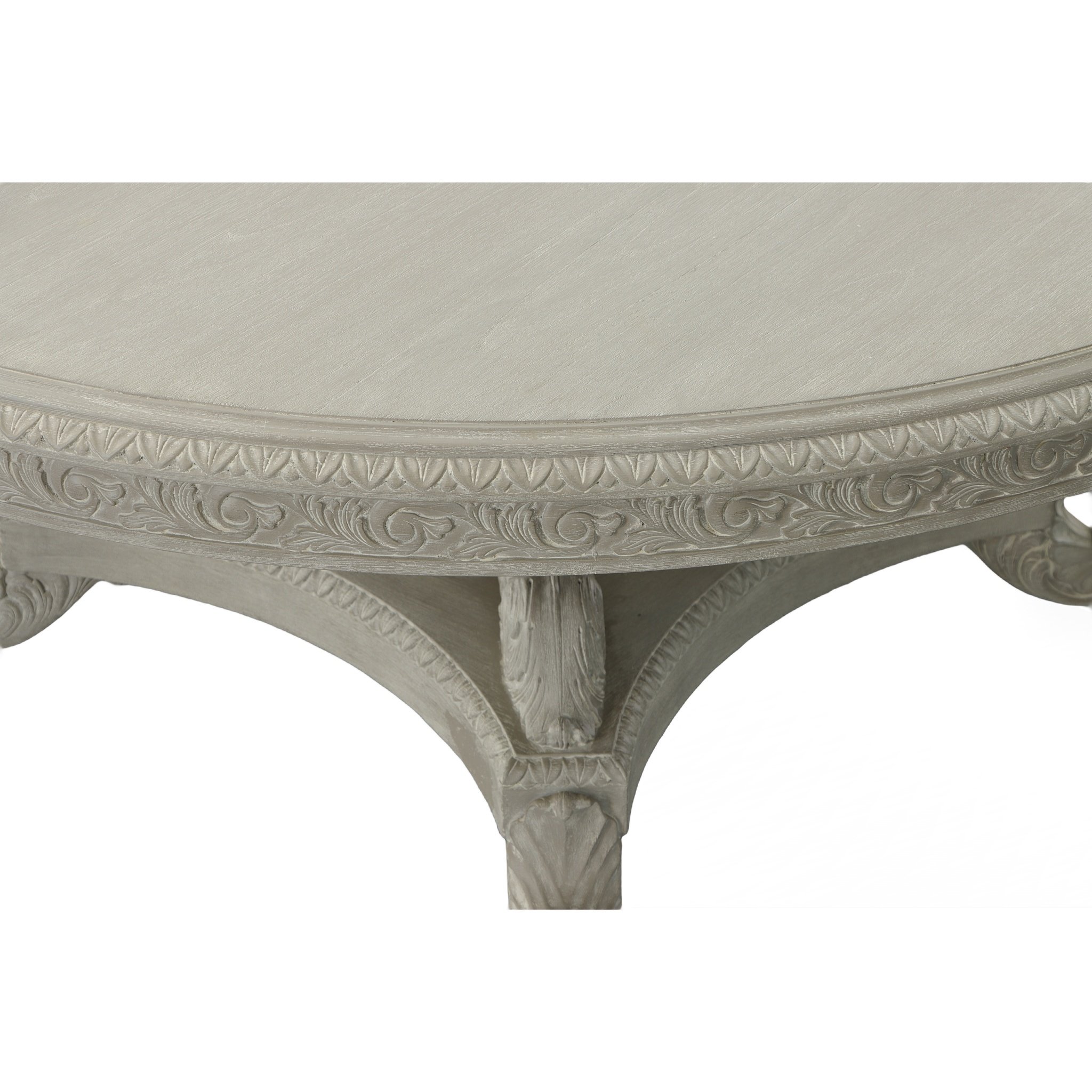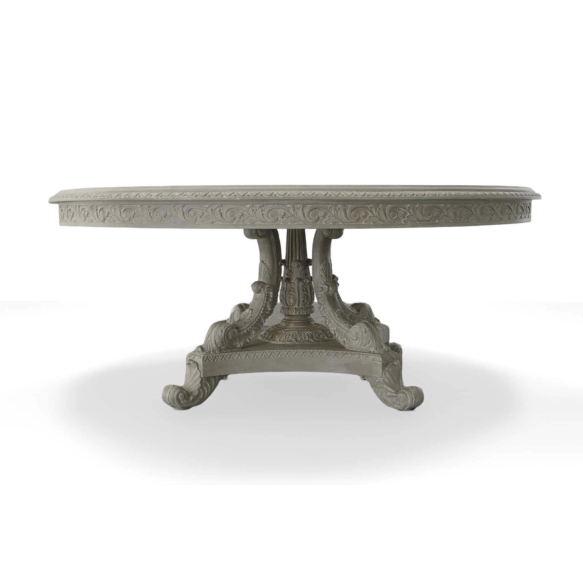 The Anglia Pedestal Round Dining Table from Heritage Furniture, a centerpiece that exudes timeless elegance and meticulous craftsmanship. As part of the esteemed Heritage Collection, this table represents one of the original pieces, renowned for its stunning hand-carved details and versatile design options. The Anglia Dining Table is available with a solid mahogany wood top or a glass top, each option designed to highlight the table's exquisite base. Choose between a 60" or 72" diameter to best suit your space and design preferences. The glass top version offers a unique opportunity to fully appreciate the intricate carvings of the base, providing a clear view that complements the table's artistic appeal. Offered in all Heritage finishes, the Anglia table can be personalized to harmonize with your interior design. Whether you prefer all mystique gray finish or another combination, each choice reflects the table's adaptable elegance. The table in the mystique gray finish features turn-of-the-century styling, scaled to contemporary American standards, showcasing the depth of its carving and the craftsmanship invested in every detail. Constructed from kiln-dried mahogany sourced from replanted forests, the Anglia table emphasizes Heritage Furniture's commitment to environmental responsibility. The wood is carefully prepared to ensure lasting stability and durability, with each table undergoing rigorous stress and pressure testing. Pair this magnificent table with casual dining chairs like the Bordeaux or explore other Heritage Seating Options to create your ideal mix-and-match set. For a fully coordinated dining experience, consider the Anglia Lazy Susan, especially if selecting the larger tabletop. Handmade and imported from Indonesia, the Anglia Pedestal Round Dining Table is more than a piece of furniture—it's a functional work of art, backed by the Heritage warranty and designed to be cherished for generations. Whether anchoring a formal dining room or serving as a grand center table, the Anglia brings unparalleled beauty and craftsmanship to your home.