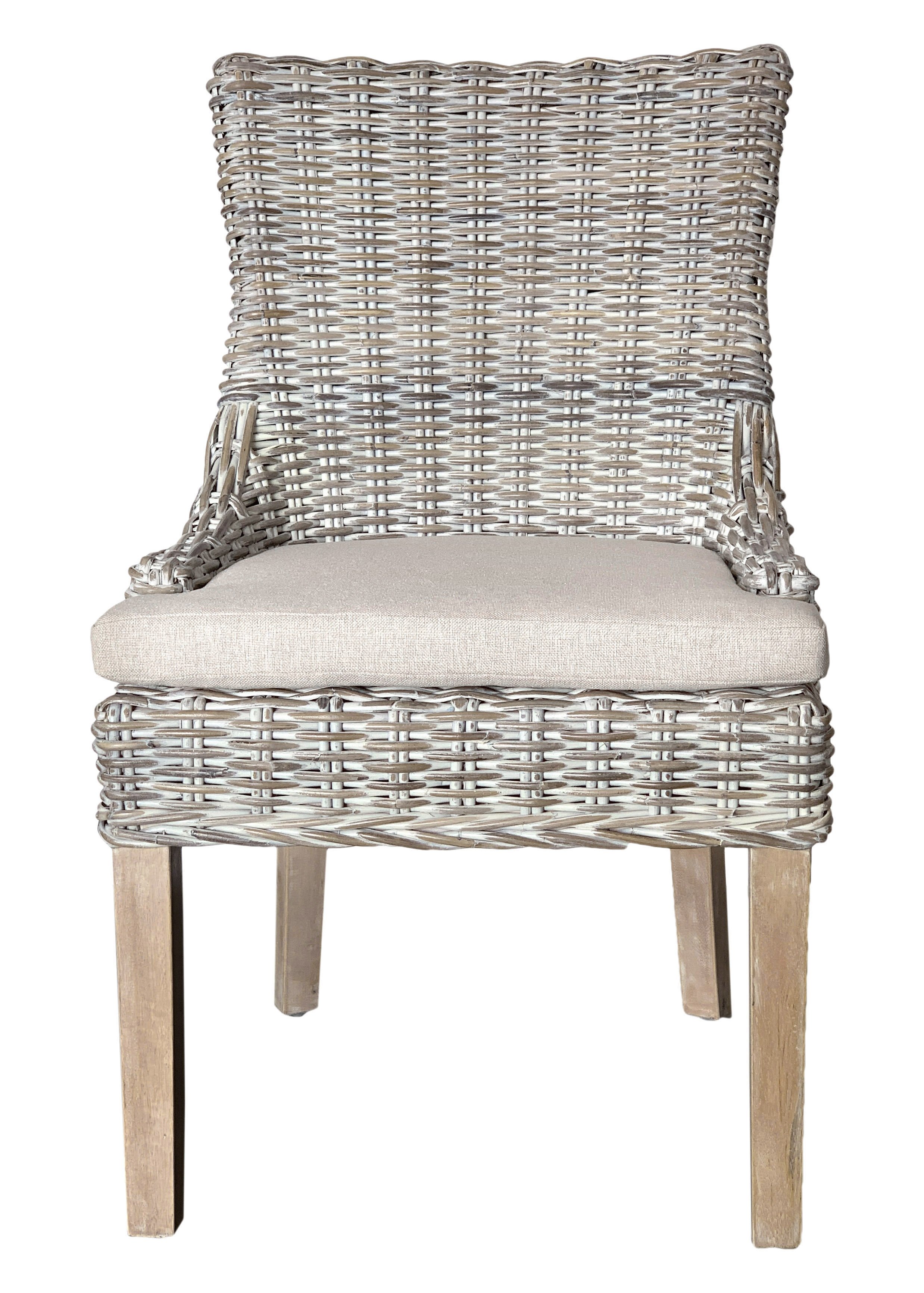 Original, Imported, hand woven Kuba Grey Weave Seating, a timeless design constructed to Last! Our Alfresco design dining chair white wash has the potential of solving many design challenges: Kuba stools and chairs have gorgeous natural colors and bring texture and interest into Interior spaces. These dining chairs work beautifully with almost any style of Table. These handwoven Kuba Stools are also chosen for their sturdy construction and will withstand use, for many years to come. They are Hand woven one seat at a time by skilled craftspeople. Manufactured to sit as comfortably as they are beautiful, the seats have been slightly widened and the backs of the chair are relaxed. You will like that the seat comes with a removable neutral cushion. The hand applied white wash finish, offering a softer tone for lighter interior requirements and works perfectly from Farmhouse to Coastal to Lighter Transitional.