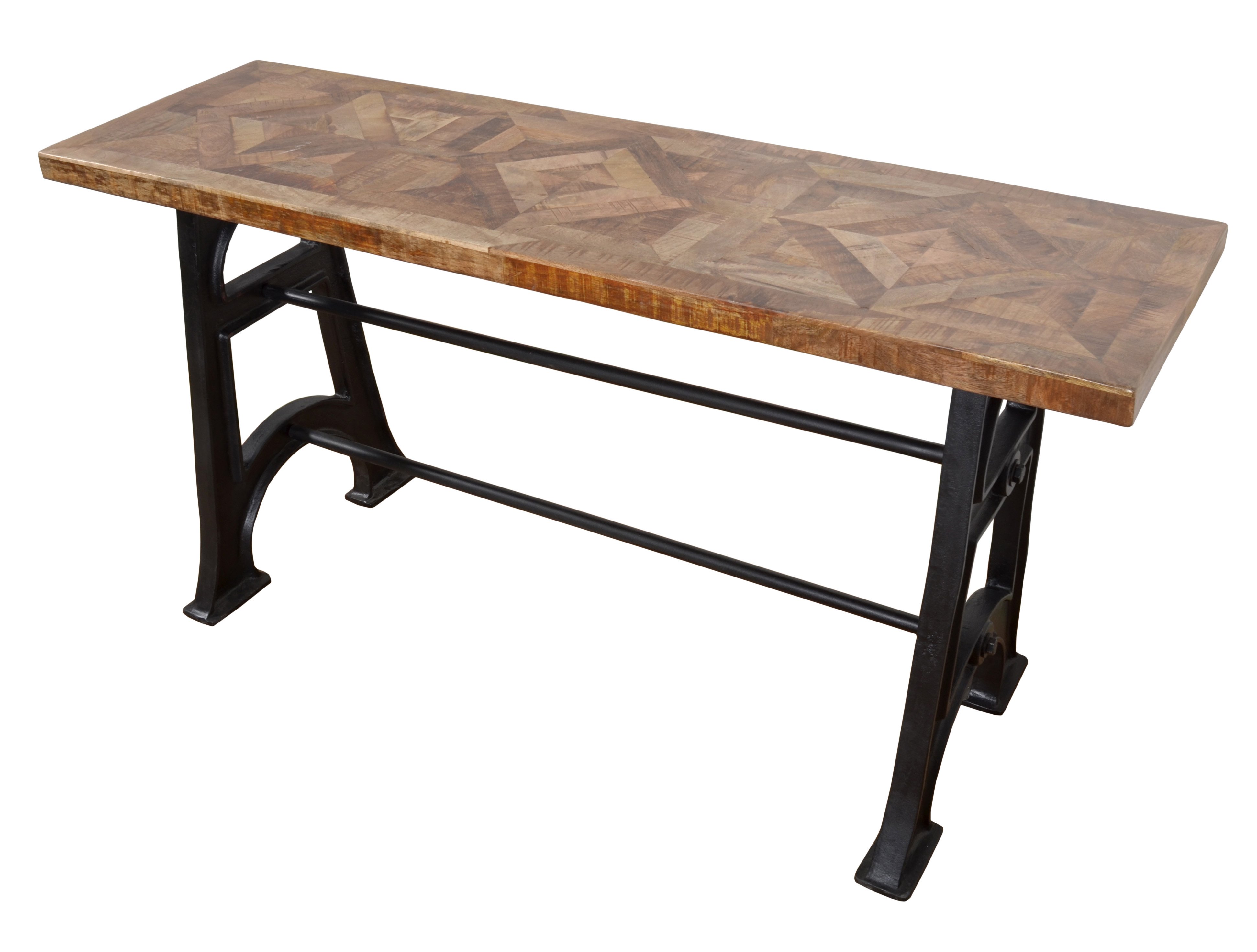 A beautiful and strong Wood and Industrial Iron Mango Parquet Console Table 60 Inch. The Console Sofa Table Top is built using Solid Mango hardwoods in an artistic parquet design. Naturally finished with a satin sheen that protects and enhances the wood for long term use. The grain of the Mango Wood offers beautiful variations of natural color with rich depth and tone. The top is mounted to an authentic Cast iron Industrial base that is heavy and stable. The base is hand cast in Iron using authentic Industrial molds. The complete table is beautiful and the strength of its construction will offer years and years of use for even the most active of families. Sold separately this console can be ordered and used separately. Consider combining with the matching Wood and Industrial Iron Mango Parquet Lamp Table 24 Inch or the matching Wood and Industrial Iron Mango Parquet Coffee Table 54 Inch to complete your desired design. Hand Made and Hand Finished in India for AFD Home. Minor Assembly Required.