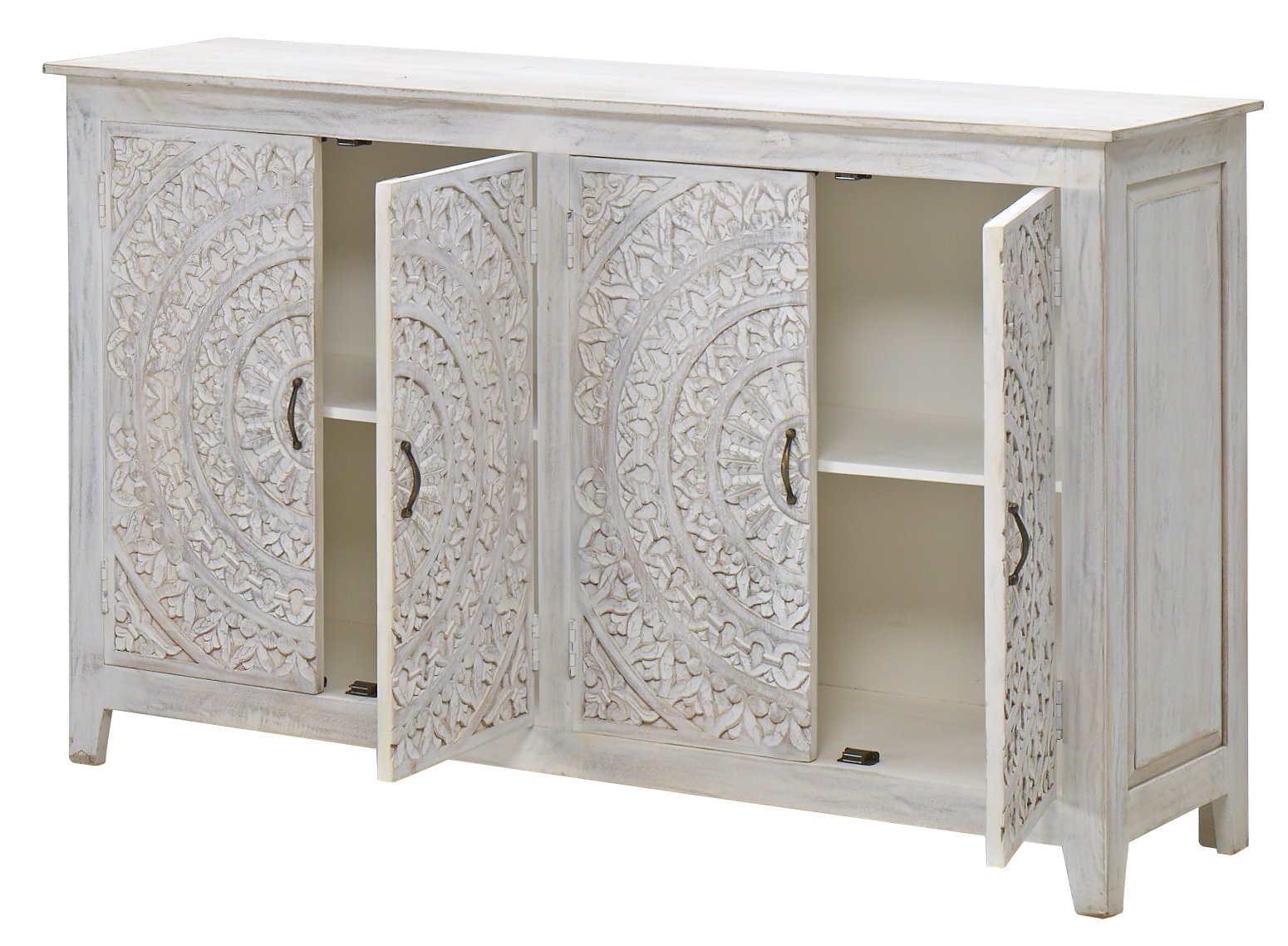 Carved Lace 4 Door, Cabinet Sideboard, Credenza, Entertainment 68 Inches offers versatility in placement and Fashion. This could easily be used in the bedroom as it offers shelf storage and a perfect base for a Big TV. it is a part of the Carved Lace Bedroom Collection. It is often sold separately because of its popularity as a stand alone unit that is placeable in designs from a Casual transitional styling to a perfect match for lots of Coastal or Farmhouse trends. It is made in solid wood, the carved lace design is Hand Carved. The cabinet features 4 large carved doors that open to expose concealed shelves. The finishing is a painted white wash. This style is very unique with the focus of the set being on the Carvings. Search for all the Carved Lace Harlow Bedroom Collection items from AFD Home and create your perfect room! It is Hand Made and Imported from India for AFD Home.