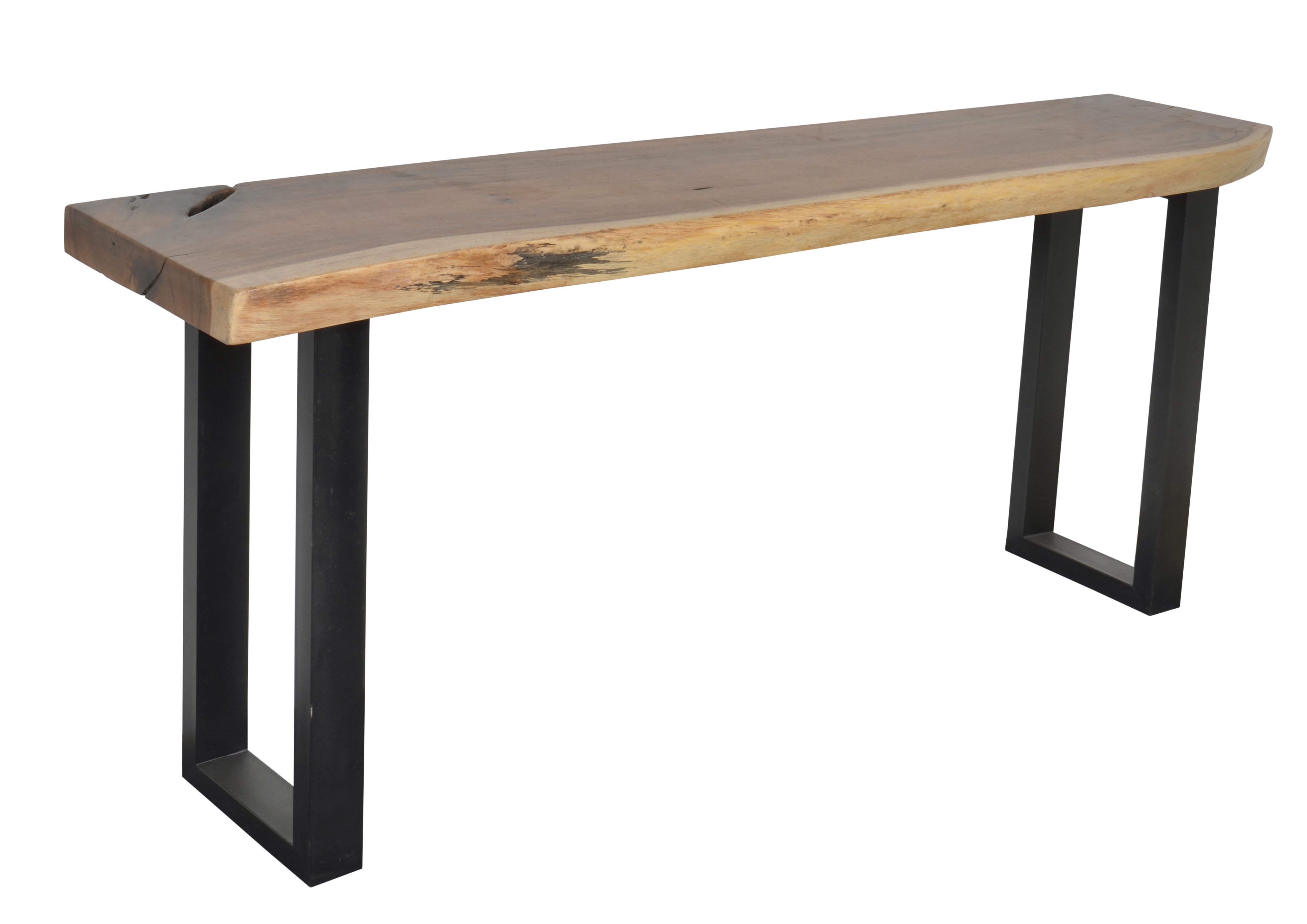 Offering a Natural Suar Live Edge Console 78 Inches Long with square Iron Legs. The extra long length requires finding the right specimen of the Suar wood. Suar often referred to as Oriental Walnut for its contrast between the darker heart of the center wood and lighter outer bands is a plentiful species. Also referred to as Monkey trees these big creations of nature grow tall and have large canopies that the local inhabitants love to hang around under. The black cast iron square legs enhance the cleaner style and create a strong base. The top is left Natural with clear top coating. Minor assembly of legs to base required! Imported from Indonesia!
