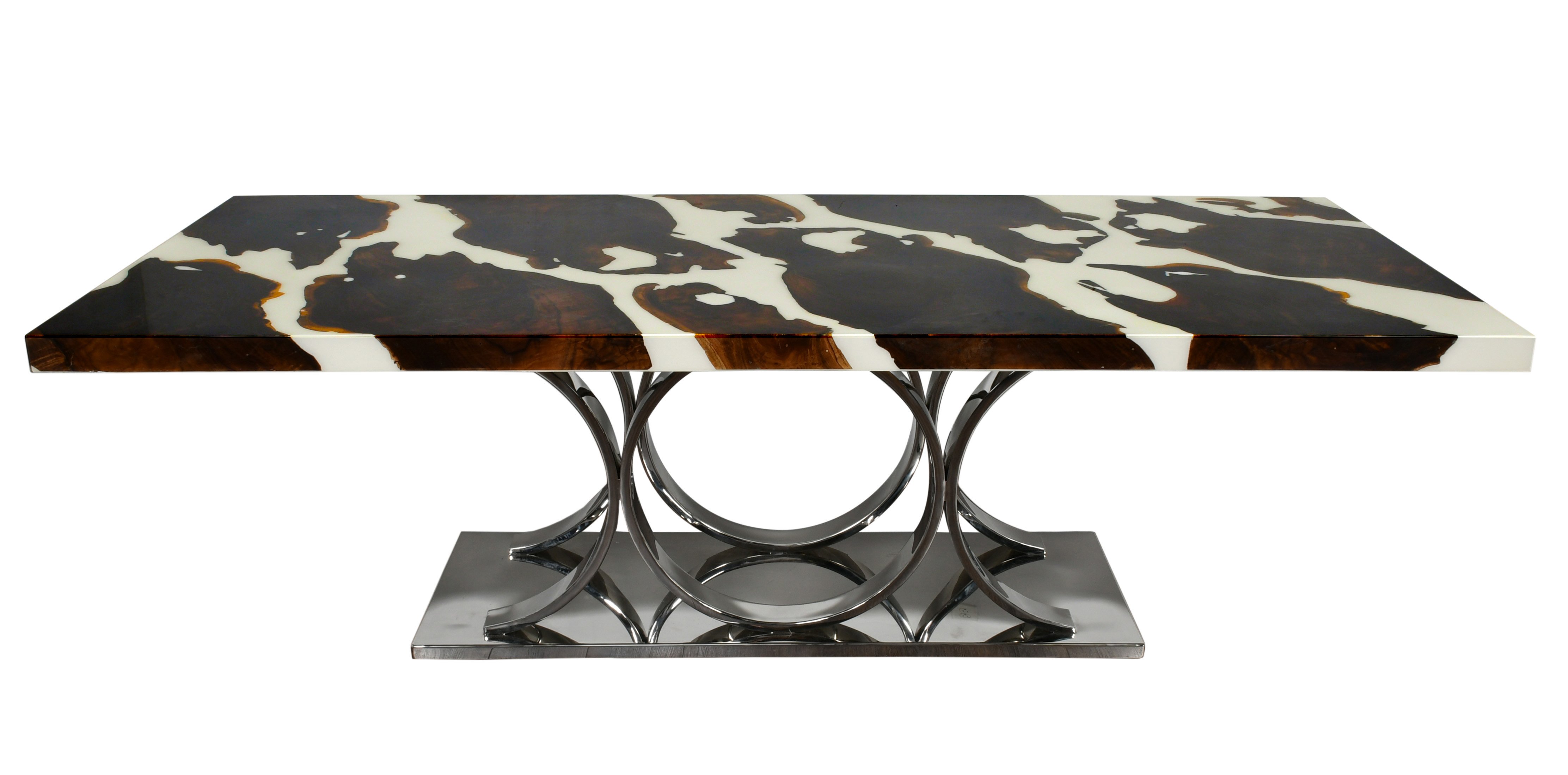 Handmade and amazing, each Artistic Floating Teak Table is unique. Natural pieces of teak wood are sealed in epoxy for a beautiful floating wood effect. This special piece is inspired by clean contemporary designs encasing the teak in white. The clean look of the white next to the wood is stunning. Appropriate height to be used in the dining room, the Artistic Floating Teak Table with Iron Base can seat 8. Perhaps consider using the contemporary inspired piece as a conference table. The iron base is a simple form powder coated black with a matte finish to not take away from the beauty of the table. The iron base completes the stylish design of the Artistic Floating Teak Table while providing proper support. Each table and base are made to order requiring advanced ordering if you have a deadline you wish to meet. Please contact customer service for more information regarding placing an order.
