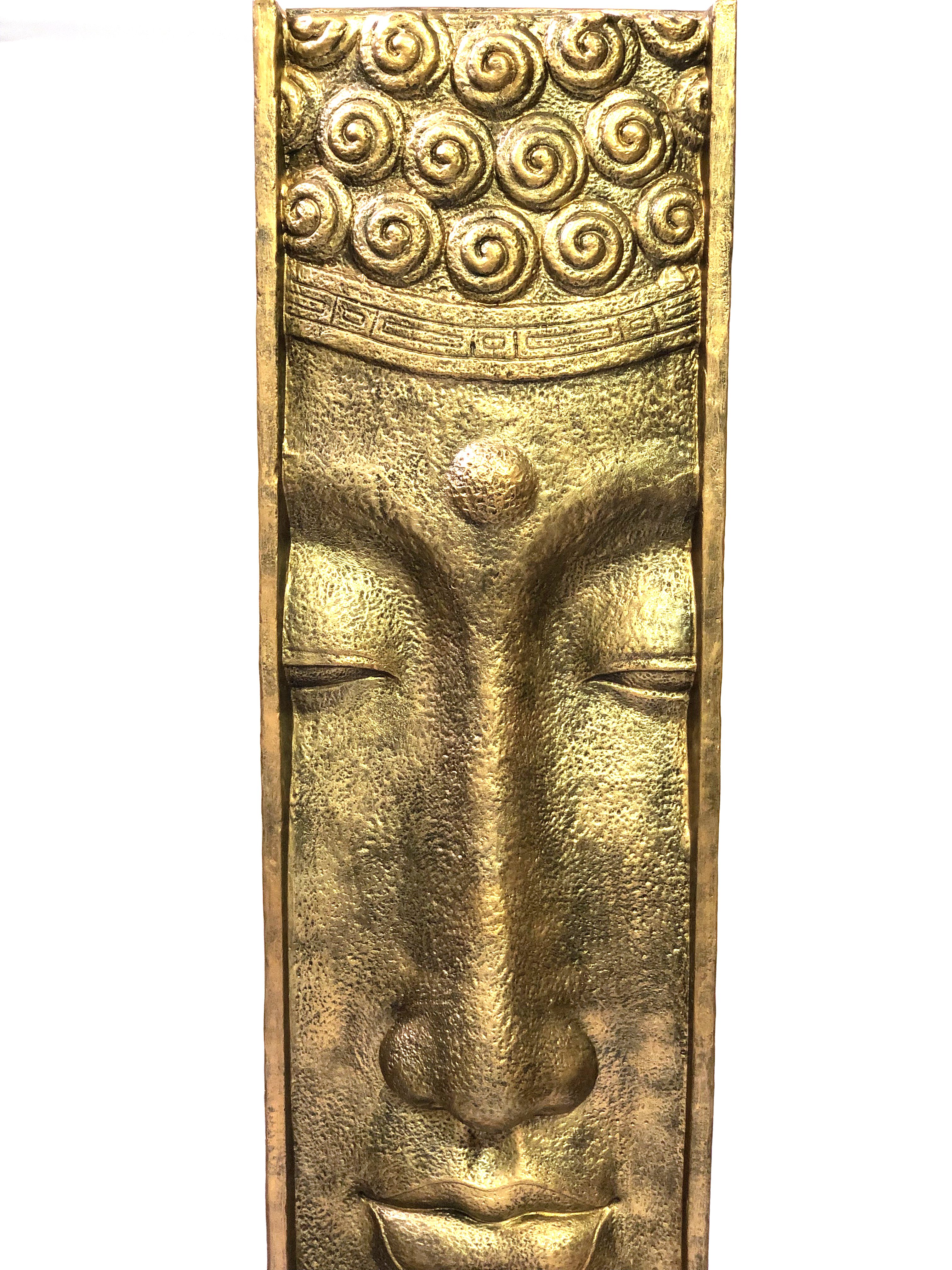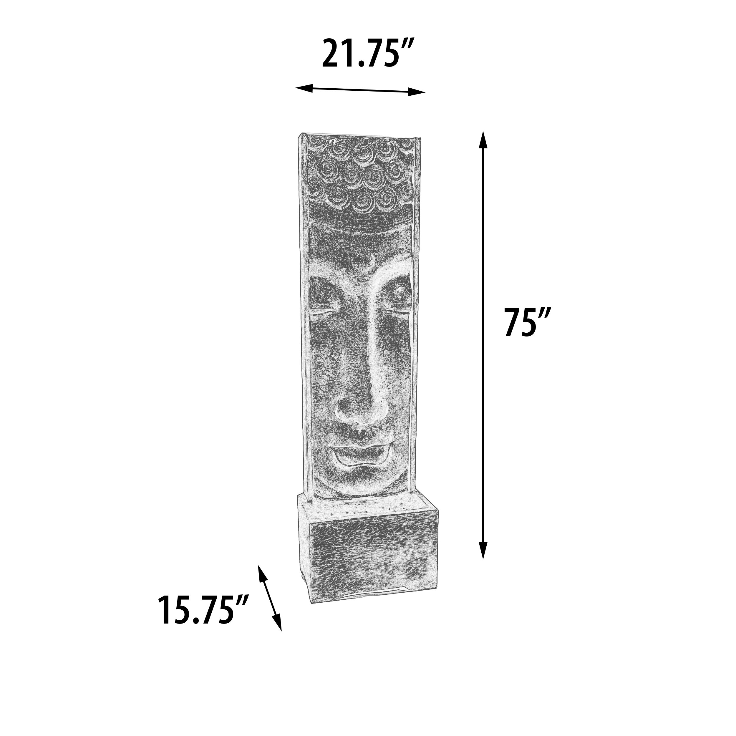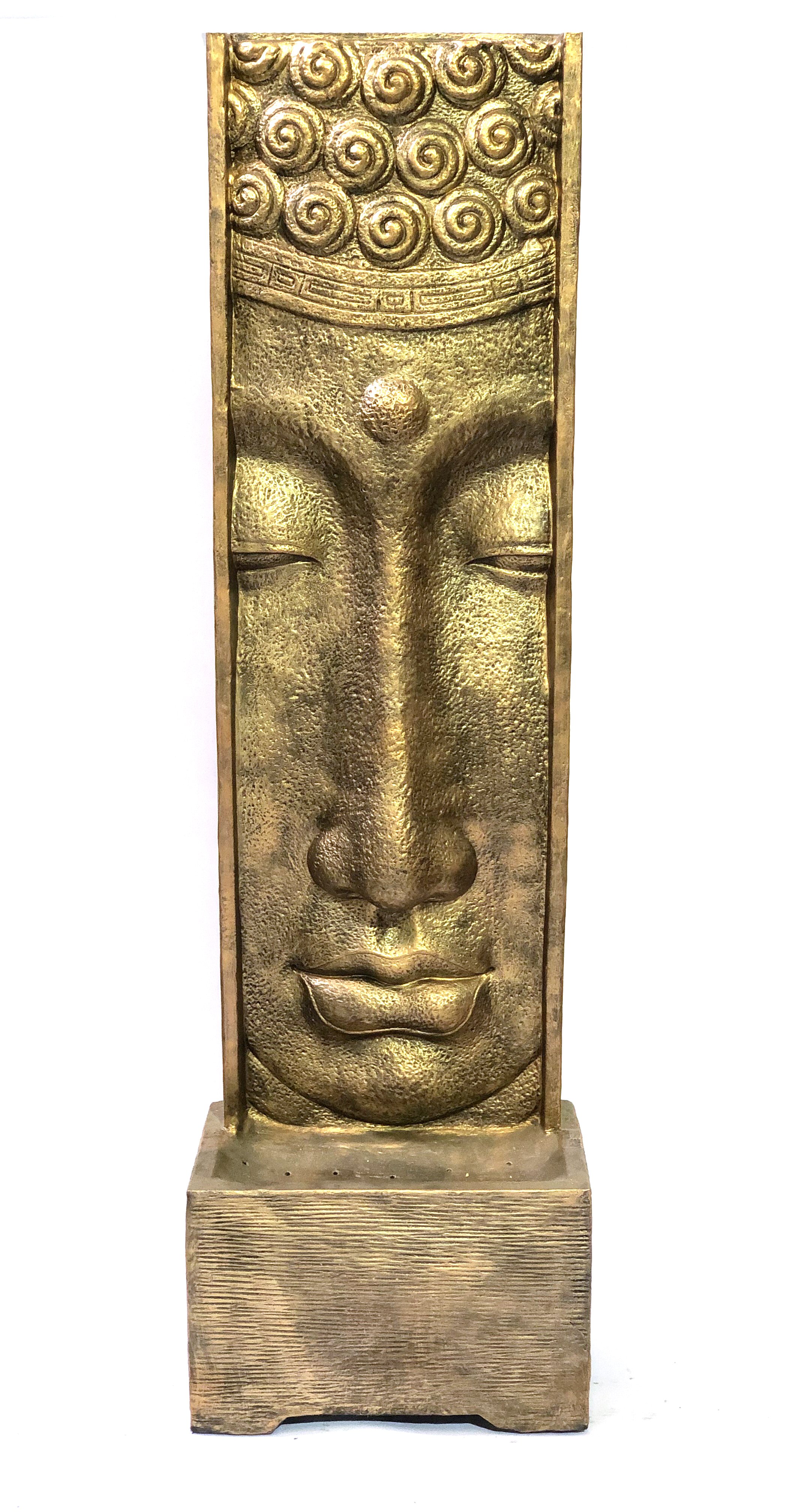 Our Large Long Face Fountain With Pump Glossy Gold Black at a whopping 74.80 " tall is a self contained water feature Fountain. The Fountain creates a cascading water affect over the main Buddha Long Face feature wall down to the surround catch basin below. The Pump is hidden from site from access from behind. The creation is hand cast and hand finished in a durable fiberglass and cast stone reinforced material. The Glossy Gold Black Finish is durable and offers a richness and quality to this functional creation encompassing the Imagery of Buddha. Buddha: prince, warrior, mediator and enlightened teacher a symbol of peace and well being establishing a mantra that all things all living creations should have peace, be happy and avoid suffering. The Life of Buddha, the One who is Awake" to the nature of reality, begins 2600 years ago in India. Quoted for his belief that “A man is not called wise because he talks and talks again; but if he is peaceful, loving and fearless then he is in truth called wise.” The Fountain is suitable for Outdoor or Indoor use. Some assembly required.
