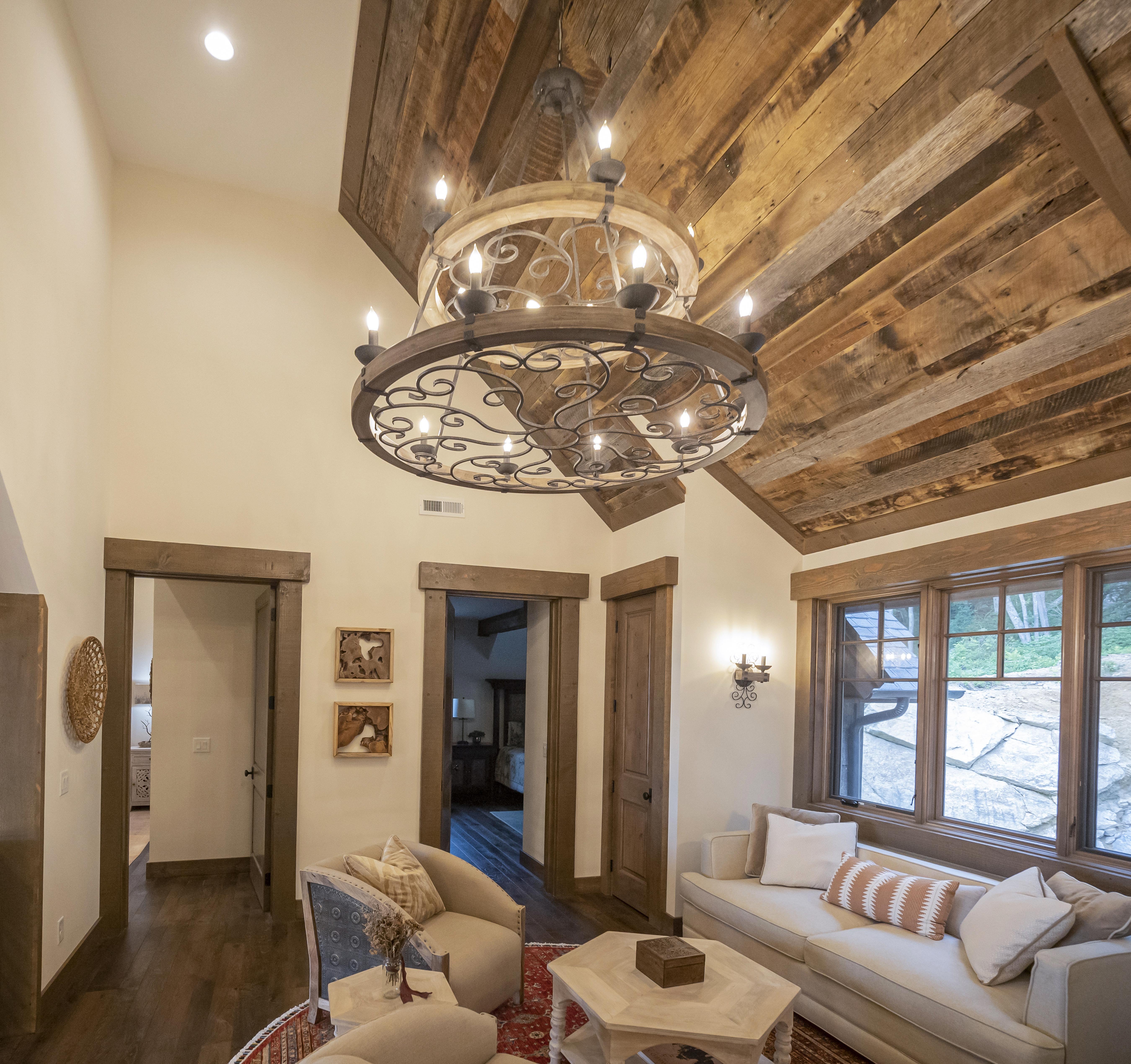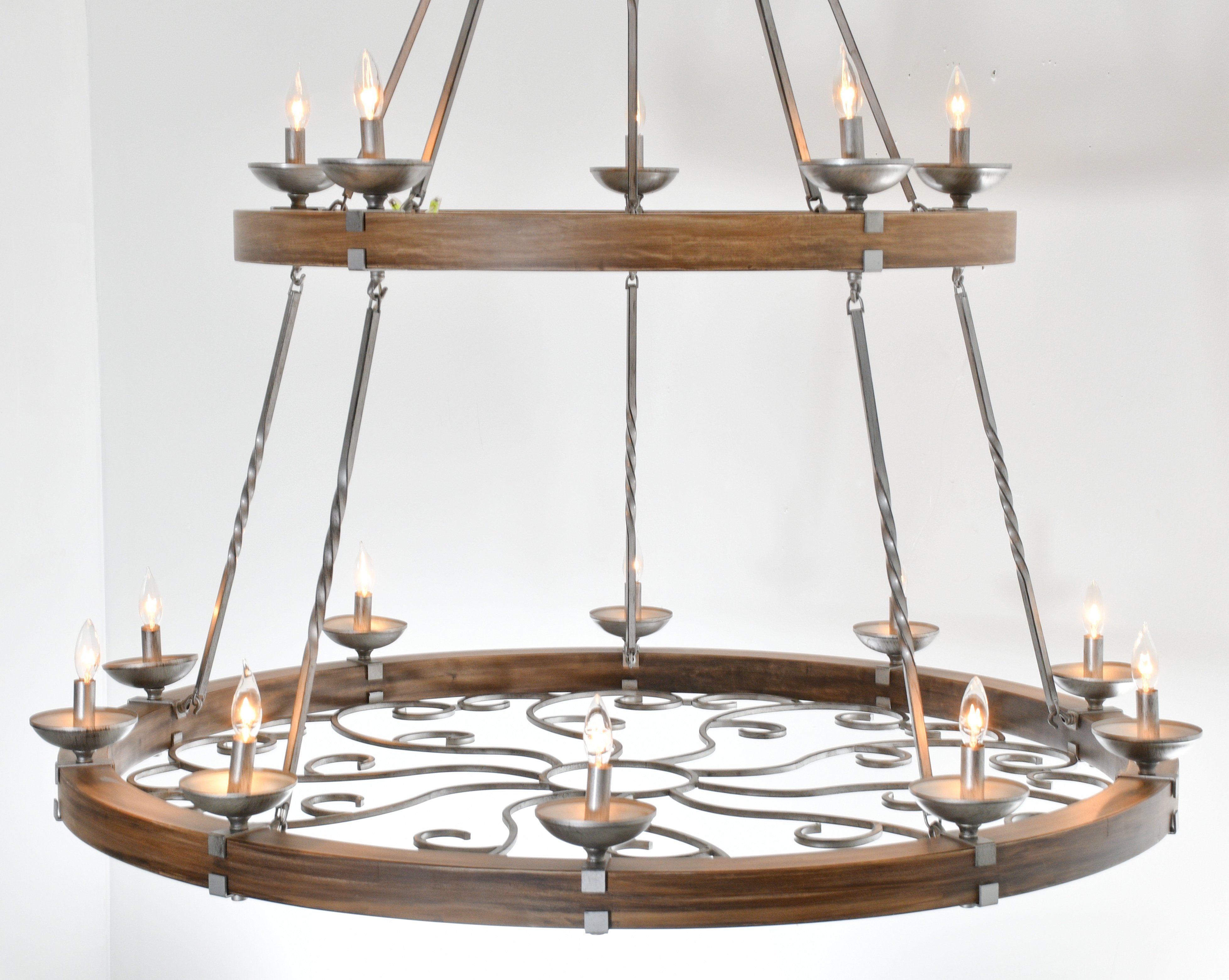 Elevate your home’s ambiance with the Two-Tier Ridge Line 56" Chandelier. This larger, 15-light fixture boasts a distressed solid wood frame and handmade vintage black rust finished metal components, offering a robust visual statement that complements any rustic or industrial space.
