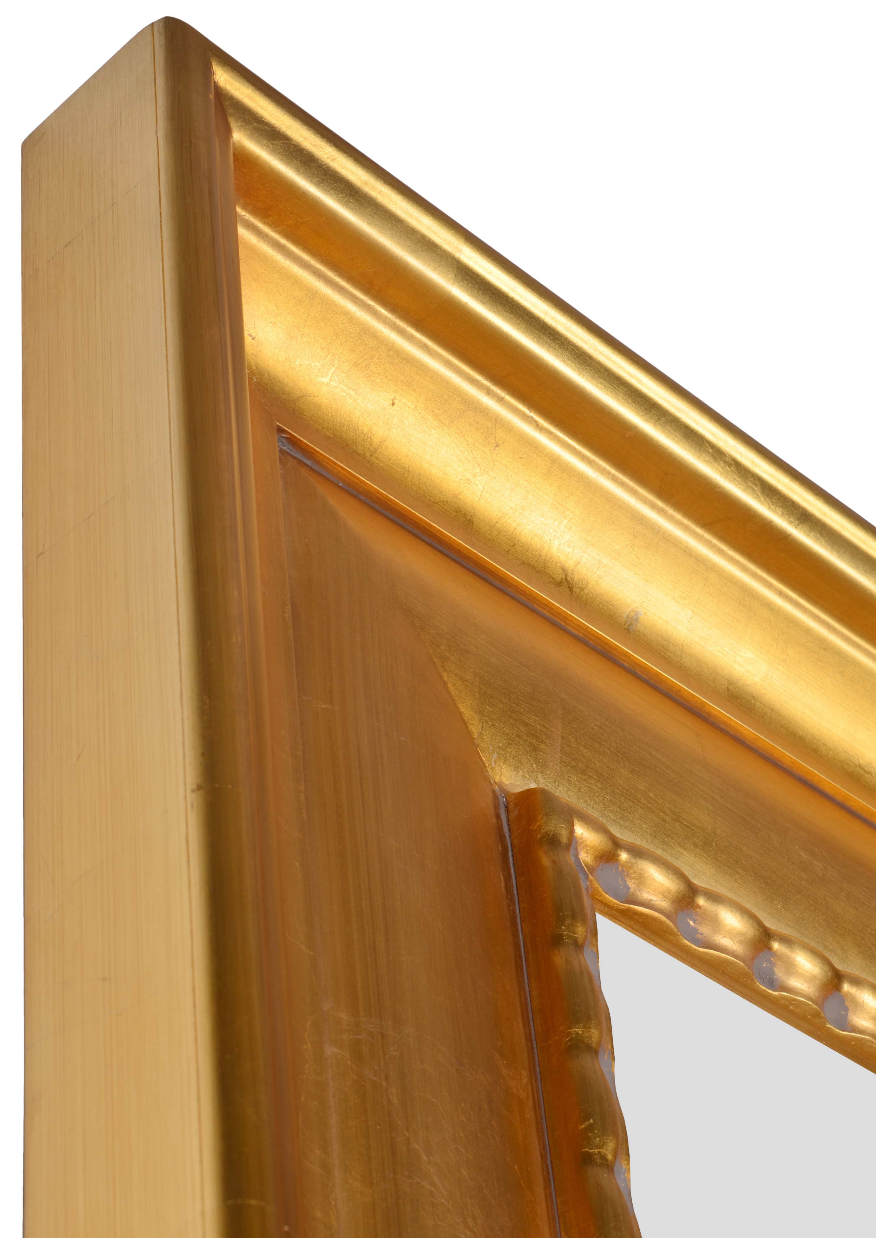 BUYER BEWARE ** The Mammoth Wood Mirror with Gold Leaf Finishing is one of the largest solid wood Mirrors available. This Mirror creates a major statement of Clean yet Massive Grandeur. Perfect for Commercial Applications in need of Spectacular. It is made in solid wood and finished by hand with stunning hand applied Gold Metal Leaf finishing. Gold finishing one of the popular finishes available on this large profile which is also offered in Silver leaf or Seasoned Wood. While this huge mirror is popular for simply floor leaning use, Hangers are installed for hanging but caution should be taken in doing so and make sure to secure into solid framing. The Biggest and the Best from Timeless Creations " Makers of America's Finest Decorative Mirrors" a division of AFD Home
