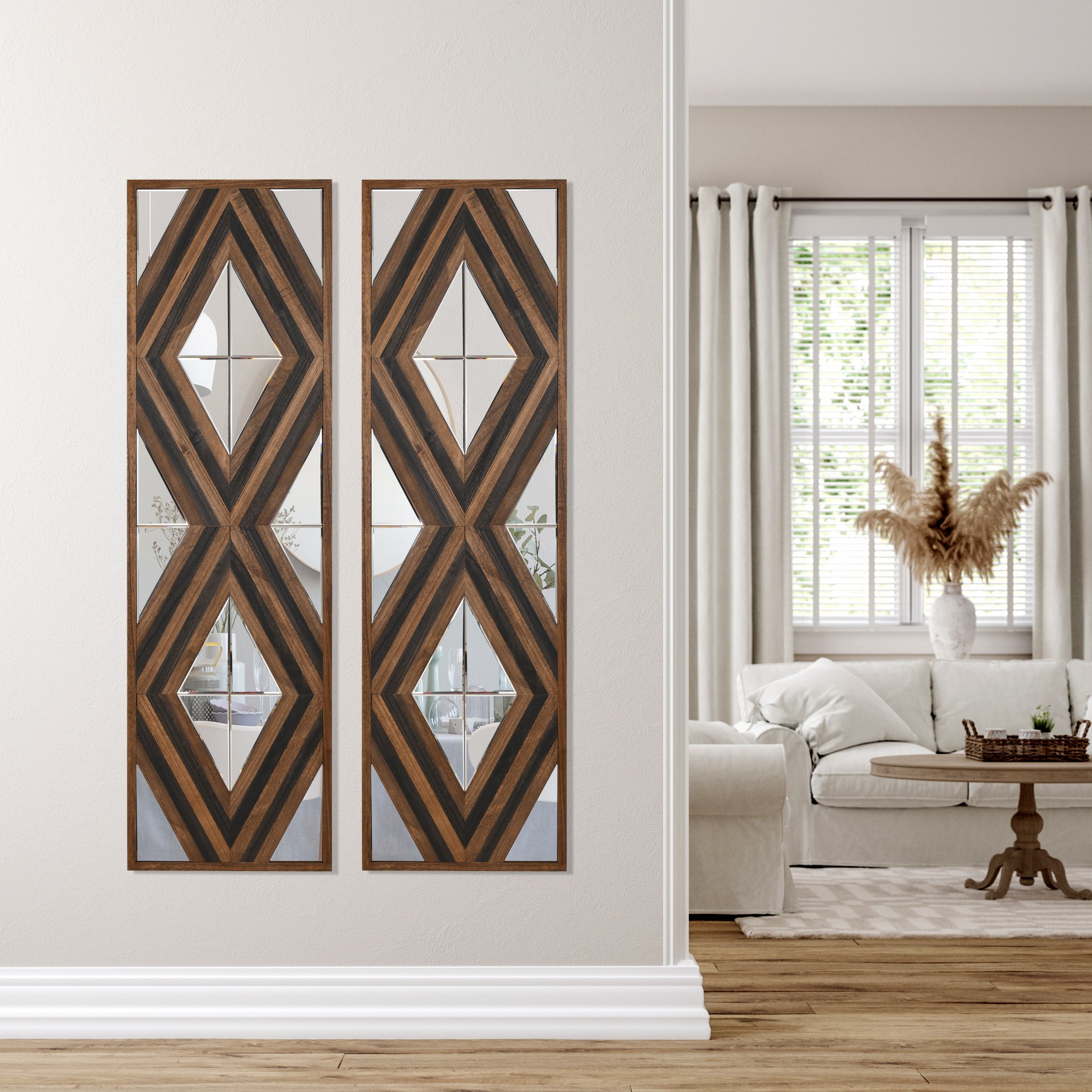 The Contemporary Aspen Double Diamond Multitone, 72 inch Mirror, measures 21.25 inches X 1.5 inches X 72.62 inches. The Aspen Series of mirrors is a modern collection of styles using diamond shapes and beveled accent mirrors to create its stunning designs. Using both medium and dark wood stains, for contrast, creates a beautiful and dramatic finished effect. The finish and design combine to create a spectacular new mirror design that would be an immediate focal point. The creation is more than a simple mirror; it transcends into the category of wall art and offers a natural organic and contemporary feeling. The mirror comes with hanging hooks installed to allow either a vertical or horizontal wall installation. This Wall Art Mirror is another functional work of art by Timeless Reflections inches Makers of the Finest Quality Beveled Mirrors inches a division of AFD Home. No Assembly required
