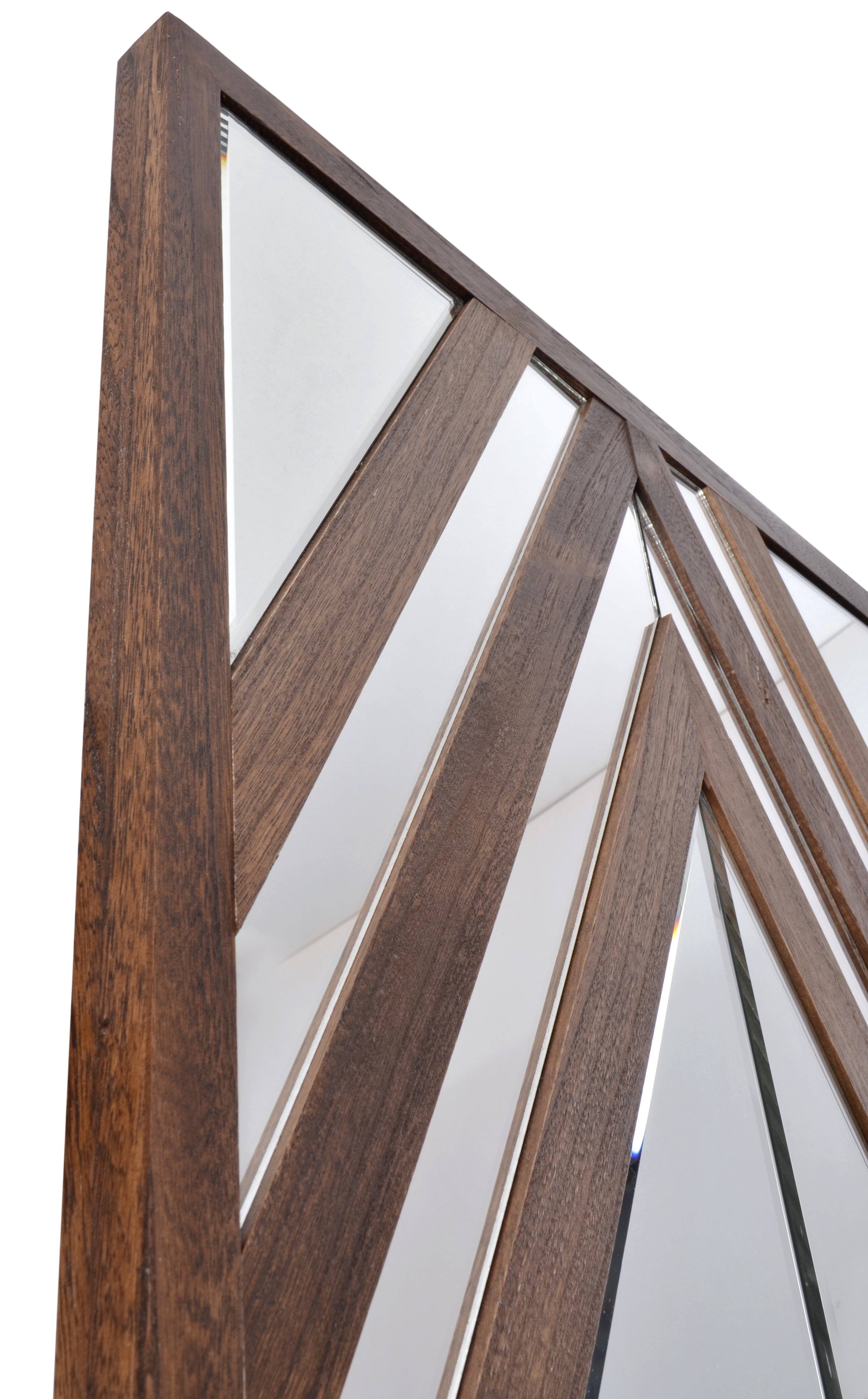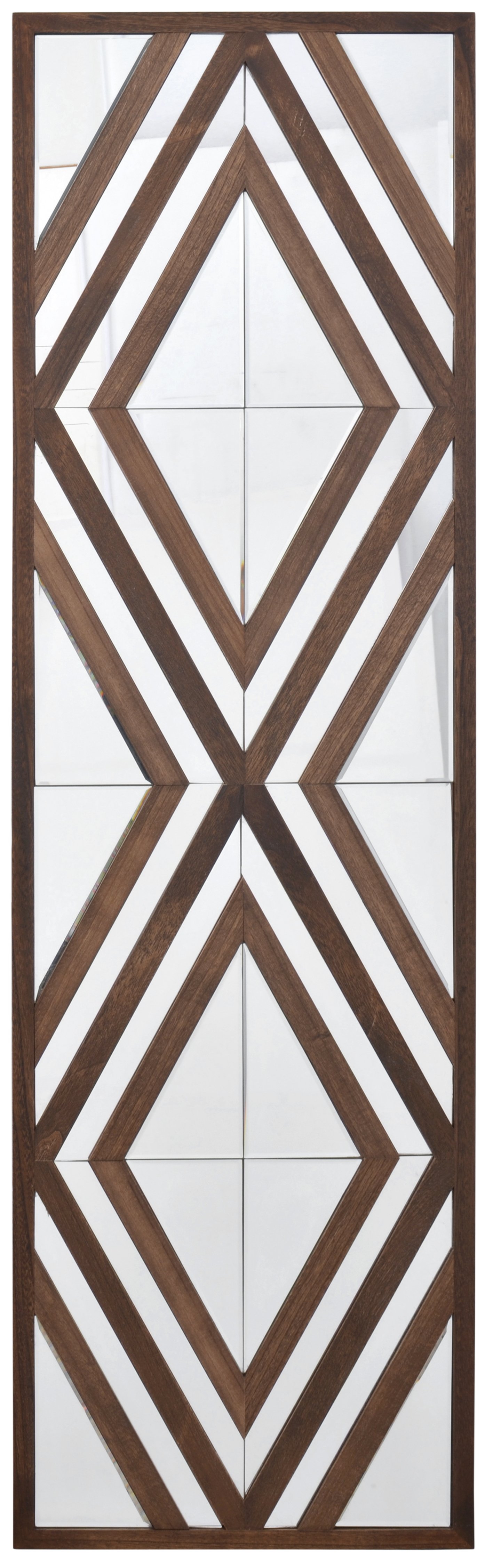 The Modern Aspen Double Diamond 74 inches Mirror measures 21.25 inches X 1.5 inches X 72.50 inches. The Aspen Series of mirrors is a contemporary collection of styles using diamond shapes and accent strips of mirror to create its stunning designs. The finish is dark wood stains creating a beautiful and dramatic finished effect. The finish and design combine to create a spectacular new mirror design that would be an immediate focal point. The creation is more than a simple mirror; it transcends into the category of wall art and offers a natural organic and contemporary feeling. The mirror comes with hanging hooks installed to allow either a vertical or horizontal wall installation. This Wall Art Mirror is another functional work of art by Timeless Reflections inches Makers of the Finest Quality Beveled Mirrors inches a division of AFD Home. No Assembly required